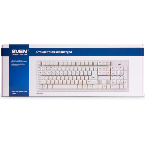 Компьютерная безрамочная проводная клавиатура Sven Standard 301 USB с русским и английским алфавитом оборудована 105 клавишами, в том числе калькулятором, кнопкой быстрого доступа к цифровому блоку и клавишами для управления подключенными мультимедиа. Тип — мембранный. Предназначена для набирания текста, но особенно для проведения бухгалтерских, финансовых расчетов и вычислений. Подключение к компьютеру осуществляется с помощью кабеля длиной 1,4 м, USB-интерфейса. Положение регулируется ножками. Размеры — 436 х 136 х 25 мм. Вес — 410 г.