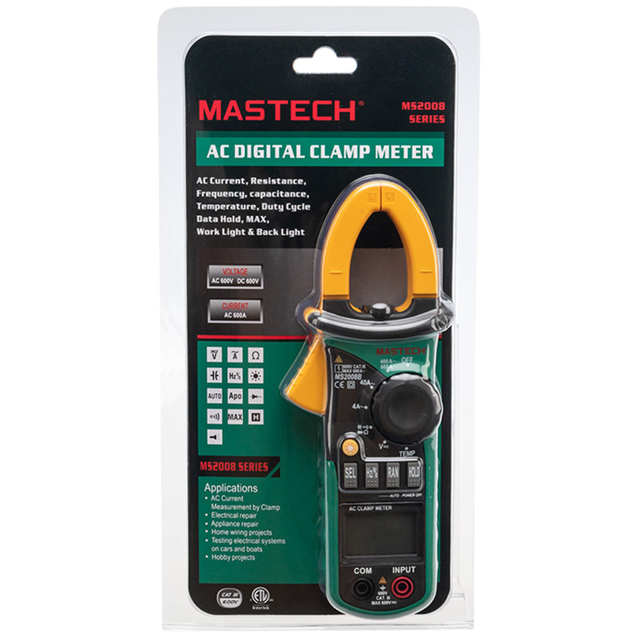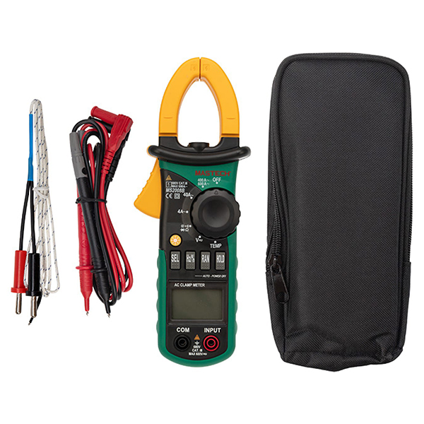 Клещи токовые Mastech MS2008B применяются для определения частотности сопротивления, объема, переменного тока, стабильности напряжения, температуры и анализа цельности цепи. Обеспечение устройства энергией происходит при помощи трех батареек типа ААА. Размеры инструмента — 20,8 х 7,8 х 3,5 см. Разрядность дисплея — 4000 отсчетов.