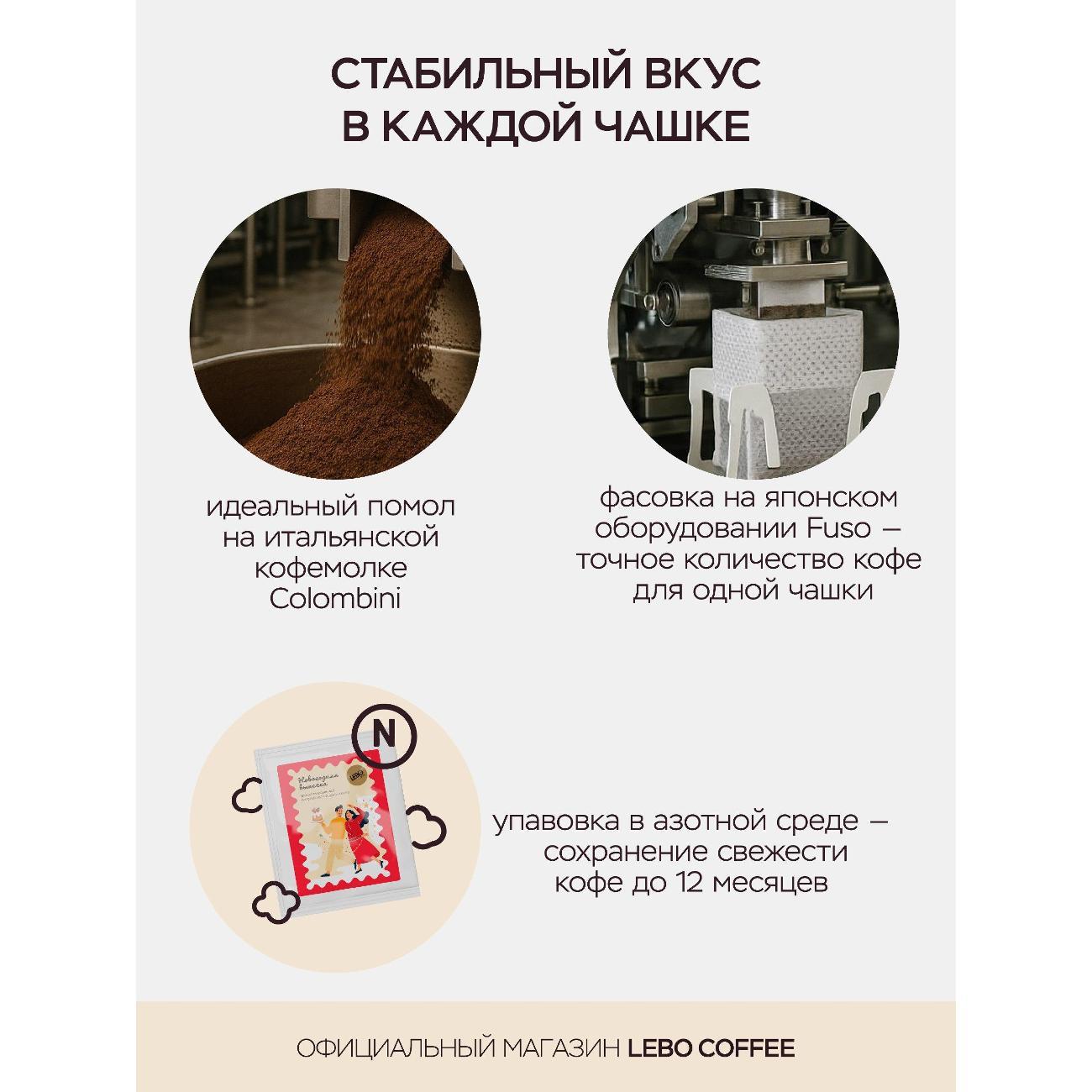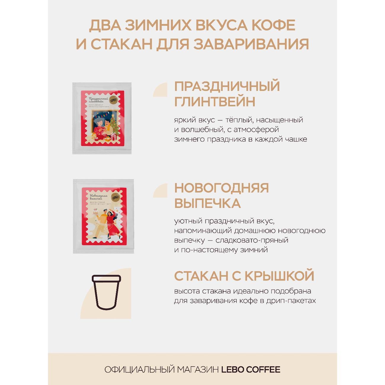 Новогодний подарочный набор LEBO - это ароматный праздничный кофе в удобных дрип-пакетах для быстрого и комфортного заваривания в любой ситуации. В каждом дрип-пакетике используется натуральный молотый кофе 100% арабика, идеально подходящий для тех, кто любит быстро заварить напиток дома, в офисе или в дороге. В комплект также входит фирменный стакан LEBO 2026 для стильного и удобного заваривания любимого кофе. Каждый дрип-пакет создан для максимально простого приготовления: откройте дрип, закрепите фильтр на чашке и залейте горячую воду - и насыщенный вкус свежего кофе готов! Такой формат в пакетиках делает напиток особенно удобным, сохраняя яркий аромат и стабильный вкус в каждом проливе. Праздничная коллекция содержит два зимних вкуса, идеально подходящих для создания уютной атмосферы дома или в гостях. Это стильный и практичный вариант подарка на Новый год, особенно если вы ищете оригинальный и полезный подарочный новогодний набор для друзей, семьи или коллег. Благодаря компактным дрип-пакетикам LEBO ваш любимый кофе всегда под рукой - легко взять с собой, быстро заварить, насладиться насыщенным ароматом и тёплой зимней атмосферой. Подарите себе и близким магию праздника в каждой чашке!