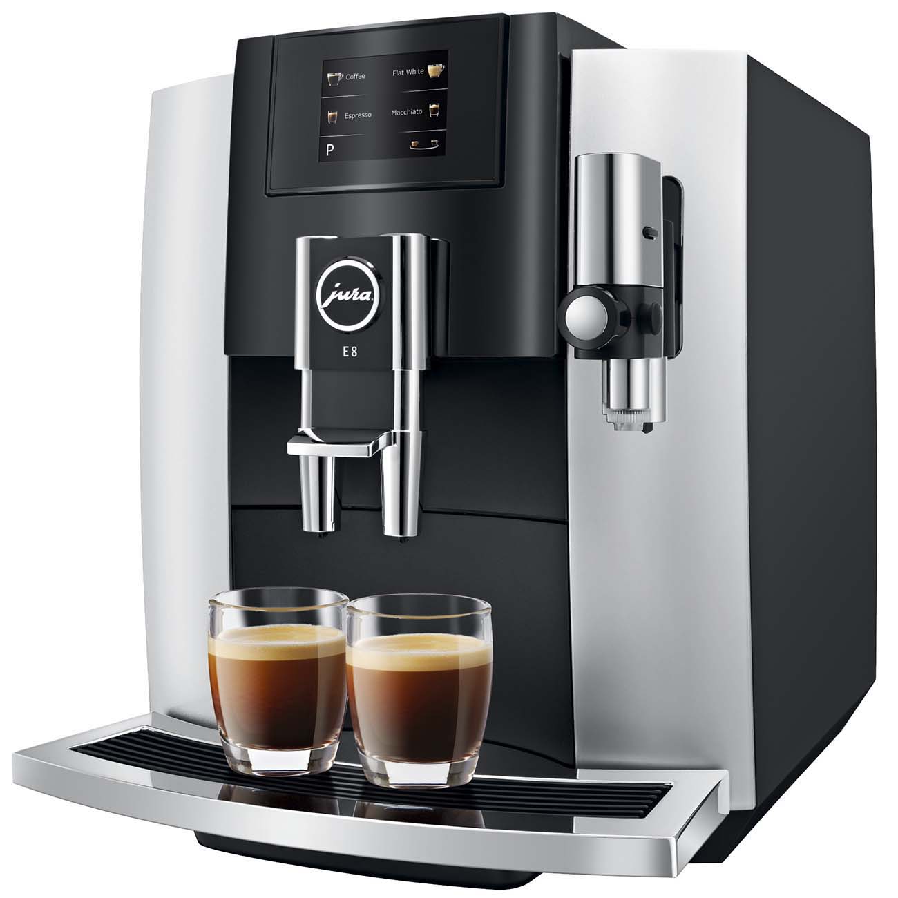 Кофемашина Jura E8 Platin приготовит эспрессо, лунго, ристретто, капучино, латте и многое другое – в «меню» есть 12 рецептов напитков на любой вкус. Для того чтобы зёрна наиболее полно раскрыли свой аромат, используется технология P.E.P. (Pulse Extraction Process): при прохождении через молотый кофе горячая вода подаётся с короткими интервалами – в импульсном режиме.