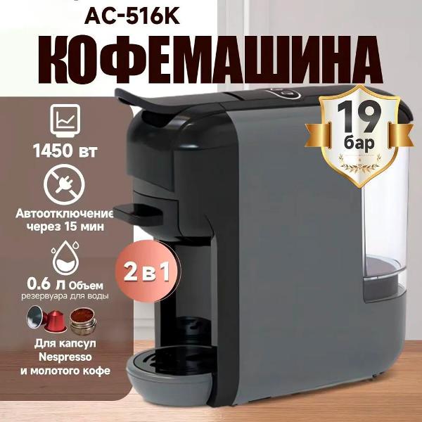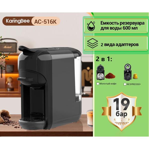 Кофемашина капсульного типа KaringBee AC-516K Grey (2 в1) предназначена для приготовления напитков из кофейных капсул Nespresso или лунго и эспрессо из молотых зерен кофе.