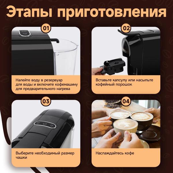 Устройство легко размещается на домашней или офисной кухне, не занимая много места. Конфигурацией предусмотрено наличие резервуара для воды объемом 0,6 л, съемной емкости для использованного кофе и съемного каплесборника.