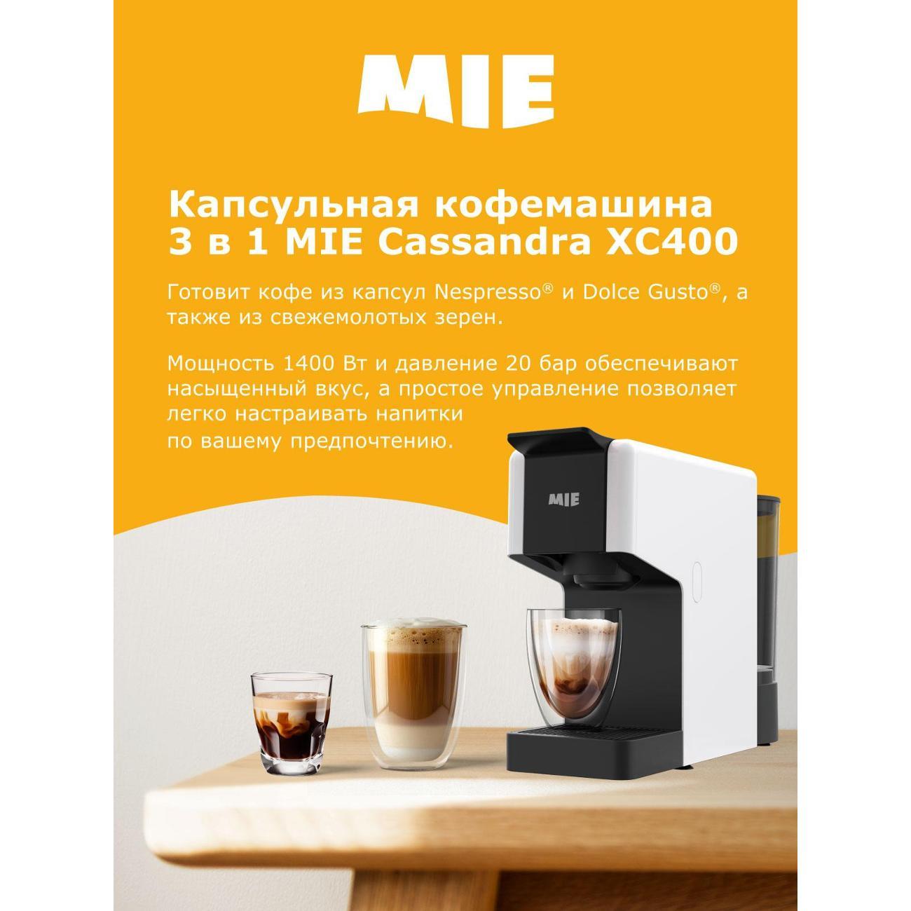 Вы можете купить Кофемашина капсульного типа Mie XC400W в магазинах М.Видео по доступной цене. Кофемашина капсульного типа Mie XC400W: подробное описание, фото и отзывы реальных покупателей, характеристики, возможность скачать инструкции и подобрать аксессуары.