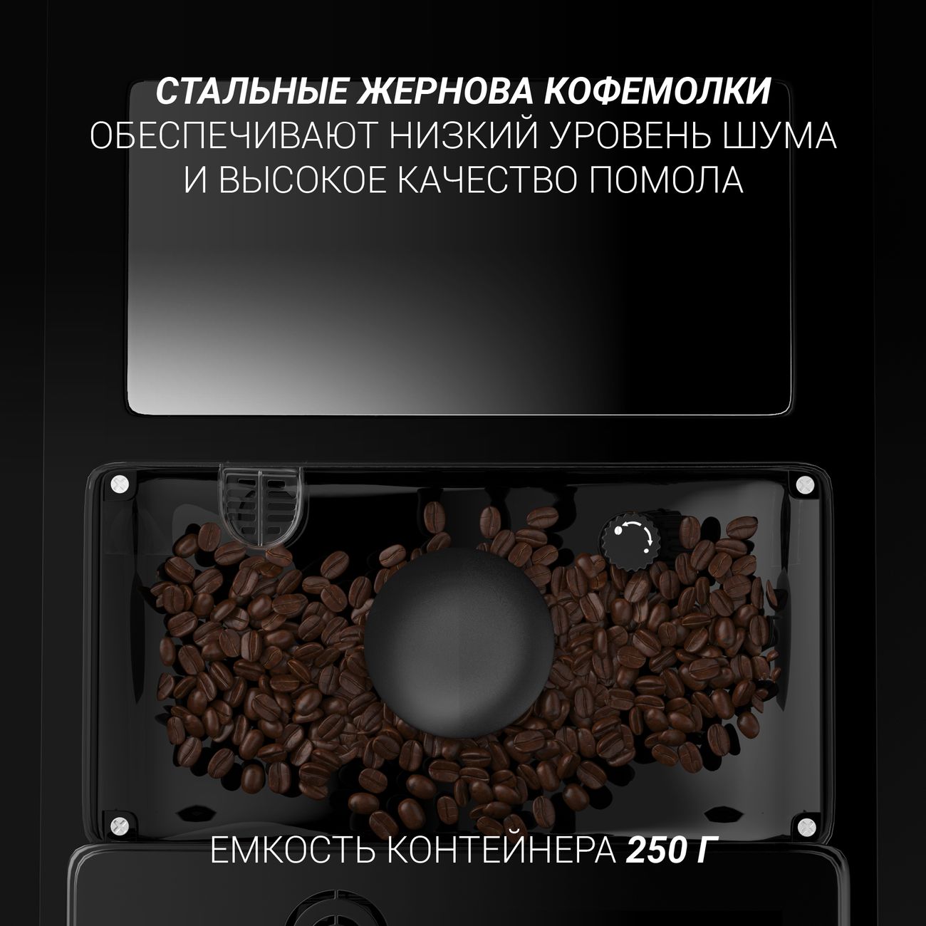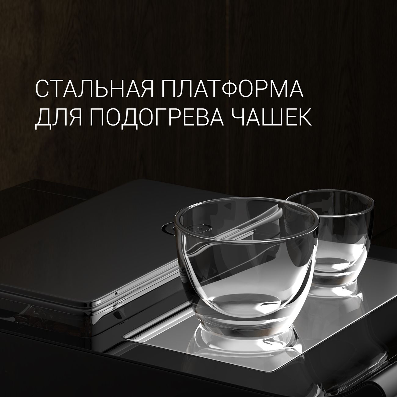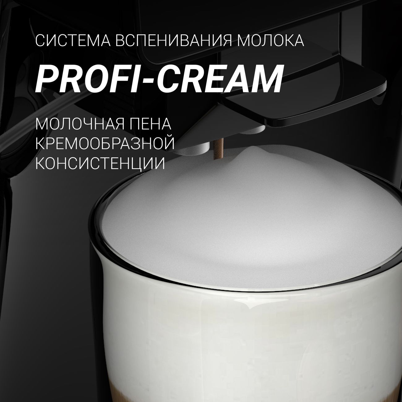 Модель с итальянской помпой работает с давлением до 20 бар. Подставка для чашек изготовлена из нержавеющей стали, не подверженной коррозии от высокой влажности. Поддон для капель вынимается для очистки. В наборе поставляются трафареты для рисунка на молочной пенке. Размер — 43,5х32,5х56 см, вес — 11 кг.