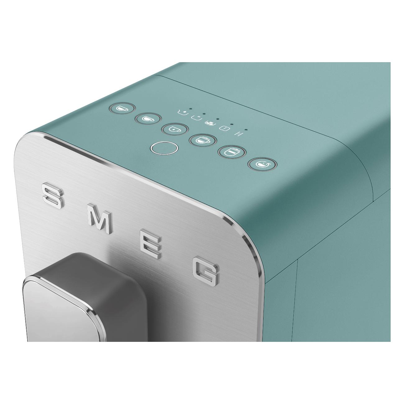 Кофемашина Smeg BCC13EGMEU — автоматическая модель зеленого цвета со встроенным автоматическим устройством для приготовления молочной пены и давлением 19 бар для приготовления эспрессо и молочных напитков.