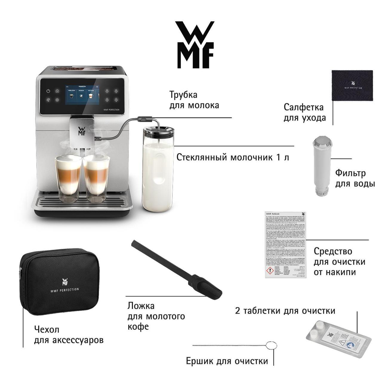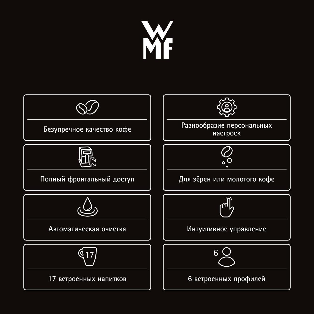 Корпус кофемашины WMF CP823A10 выполнен из нержавеющей стали и пластика. Устройство позволит для готовить кофейные и молочные напитки в домашних или офисных условиях. В устройство интегрирована кофемолка, резервуары для воды (2 л) и молока (1 л), обеспечивая бесперебойную работу без частого пополнения припасов.