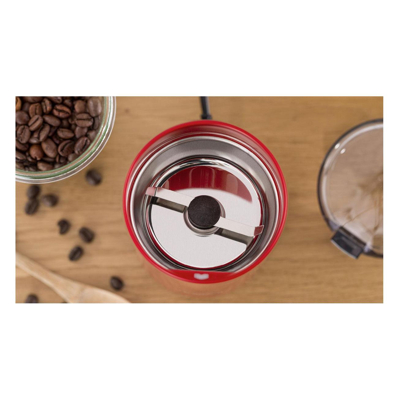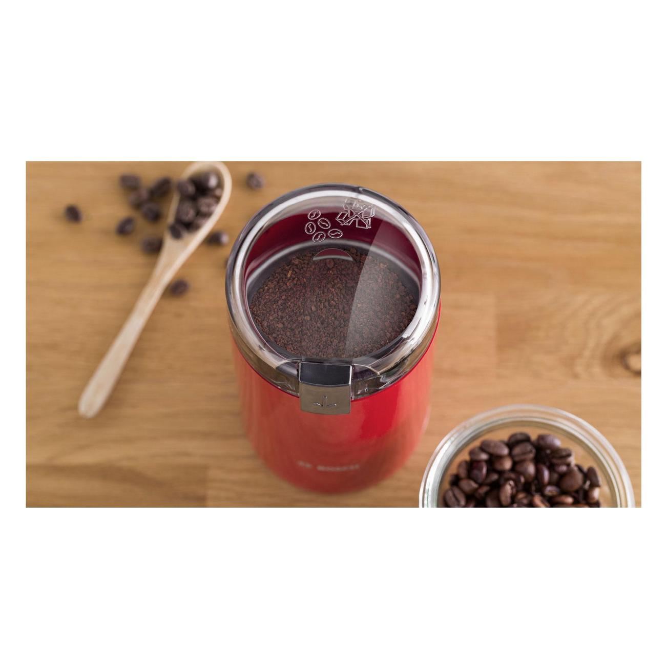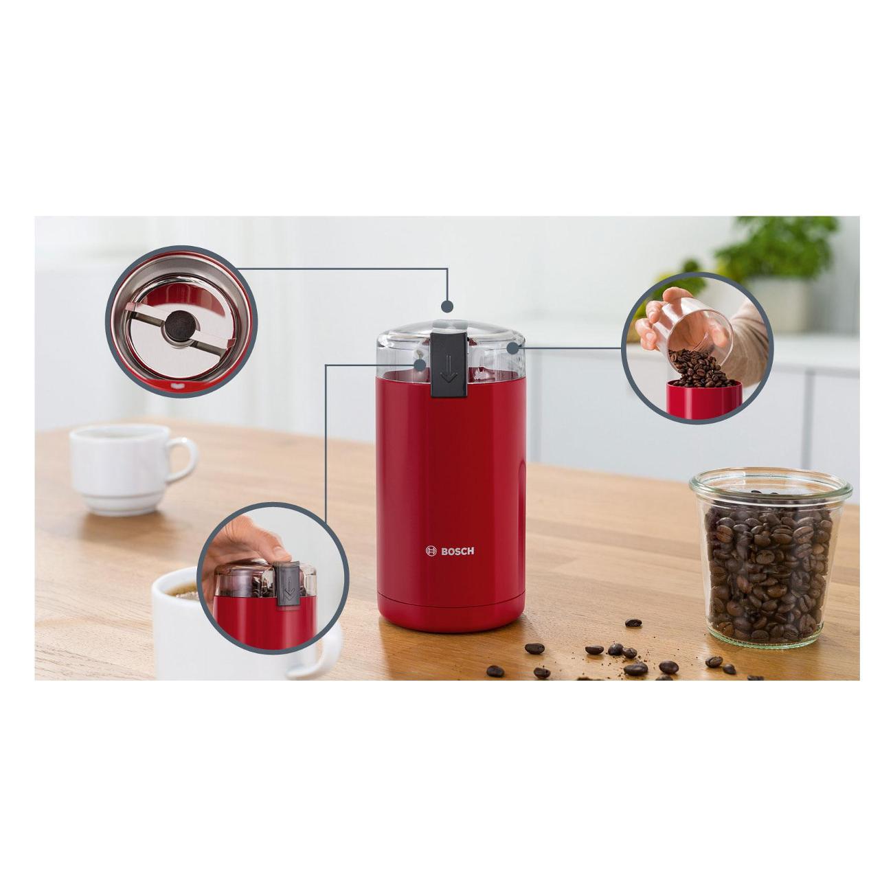 Кофемолка Bosch TSM6A014R — электрическая модель для помола кофе в зернах и специй. Корпус выполнен в красном цвете, устройство предназначено для домашнего использования.
