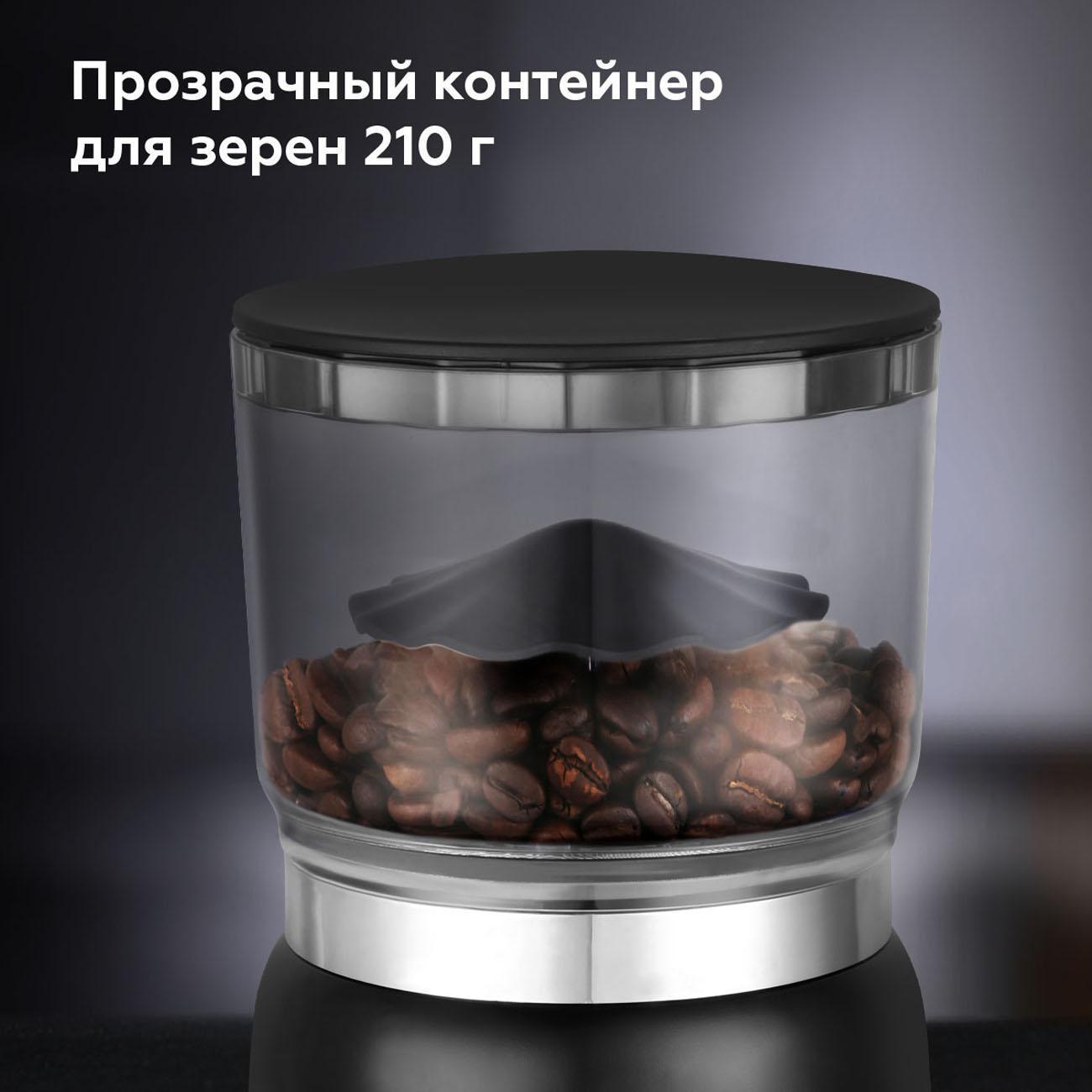 Емкость для молотого кофе составляет 120 г, что дает возможность перемолоть достаточное количество кофе для приготовления нескольких порций напитка.