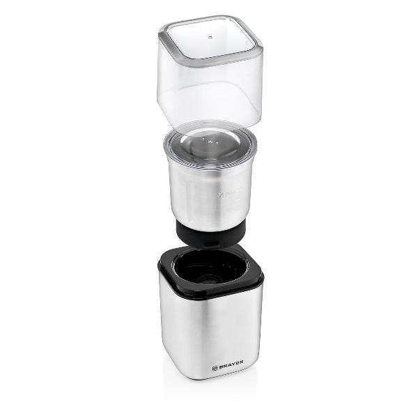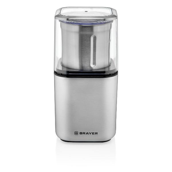 Кофемолка Brayer BR1180 — модель с серебристым корпусом из нержавеющей стали и потребляемой мощностью 200 Вт, предназначенная для помола кофе и специй.