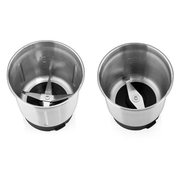 • Комплектация 2+2: две чаши и два ножа из нержавеющей стали для мягких и твёрдых продуктов — позволяет подбирать помол под разные задачи.