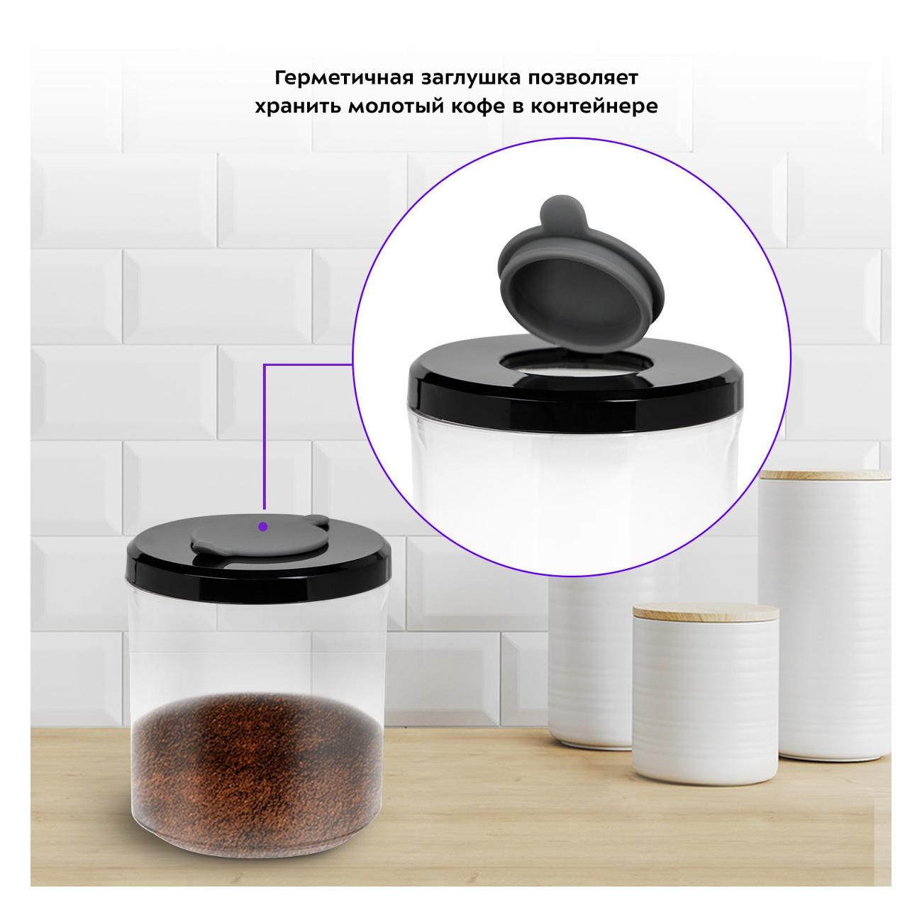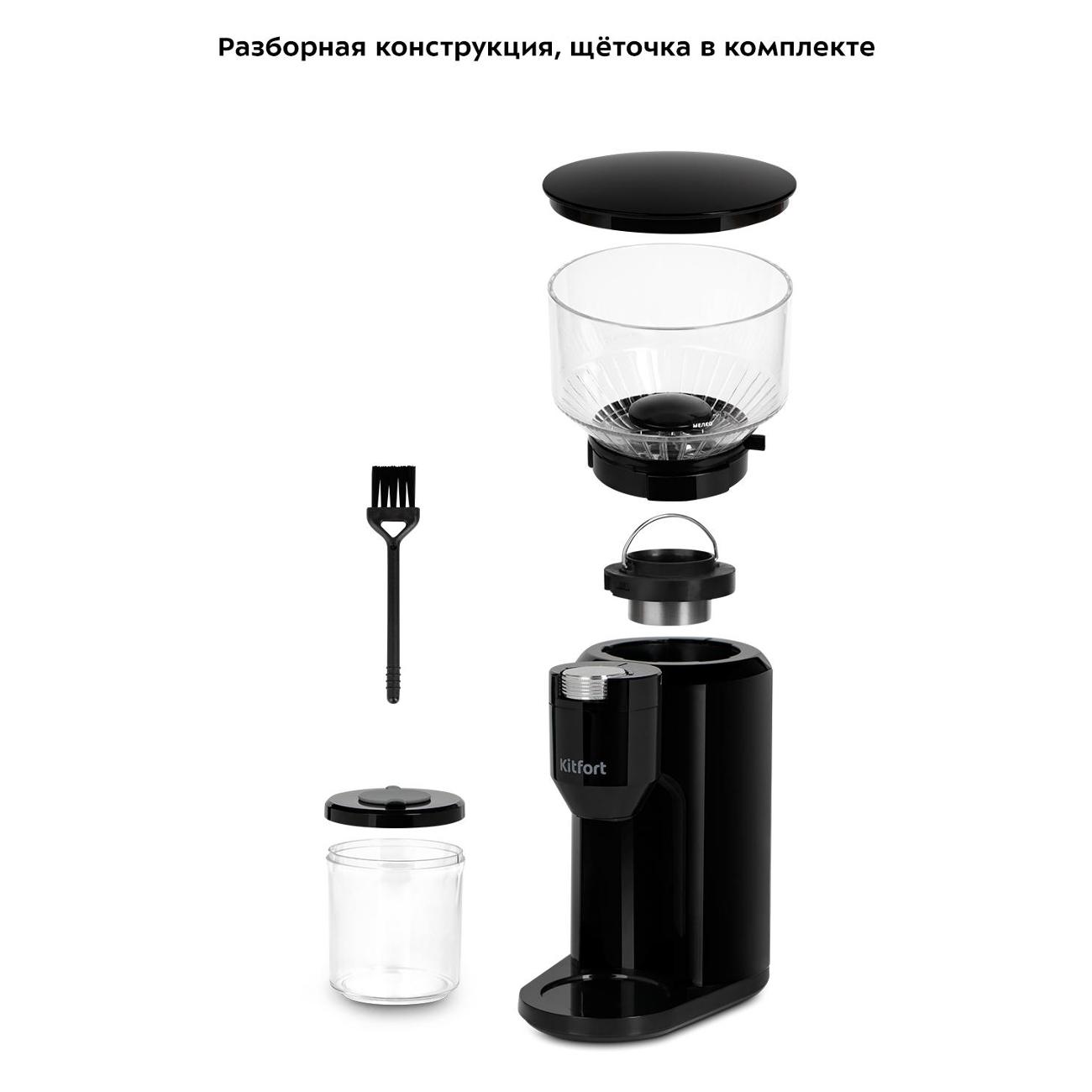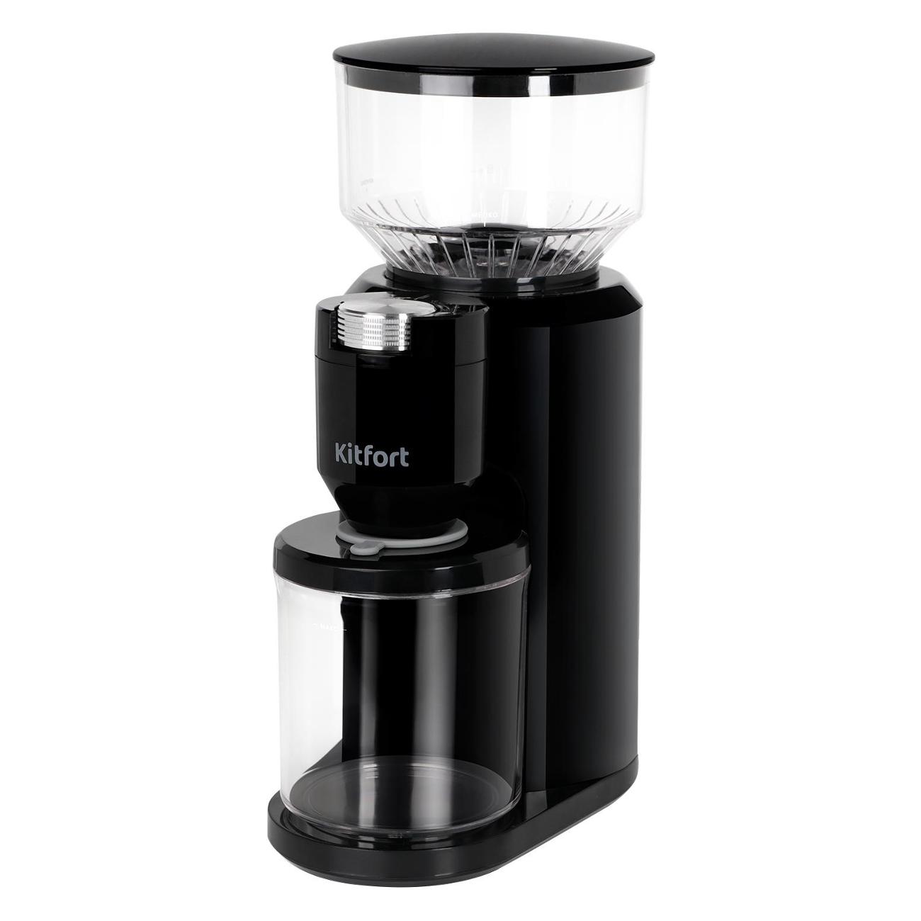 Кофемолка Kitfort КТ-7117 оснащена двумя контейнерами: для зерен объемом 200 г и для молотого кофе объемом 120 г. Последний снабжен крышкой, что позволяет хранить кофейный порошок без потери вкуса и аромата. Принцип работы кофемолки заключается в перемалывании зерен между жерновами. Это предотвращает нагревание кофейных зерен и потерю аромата.