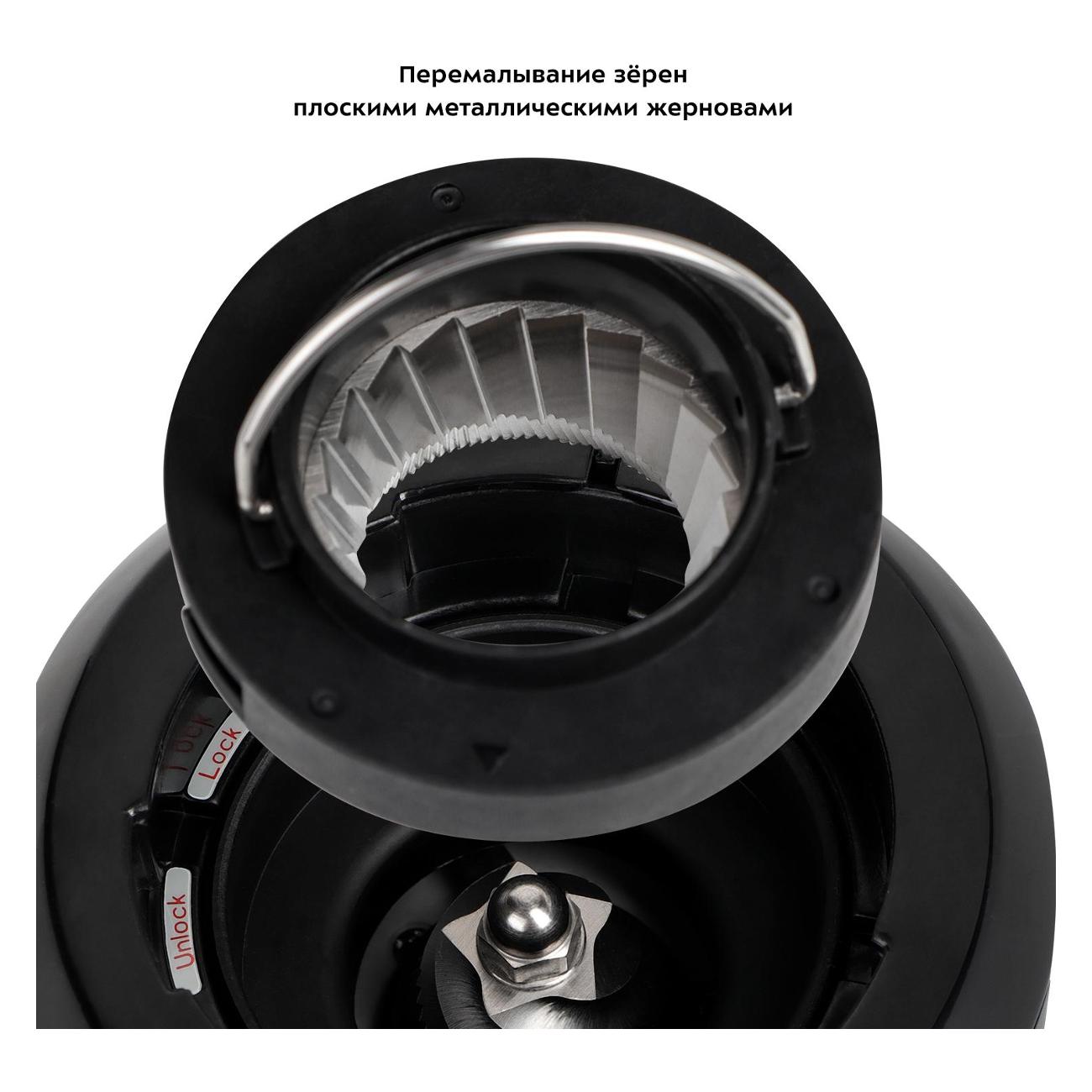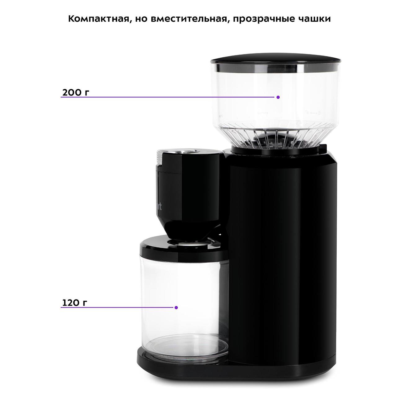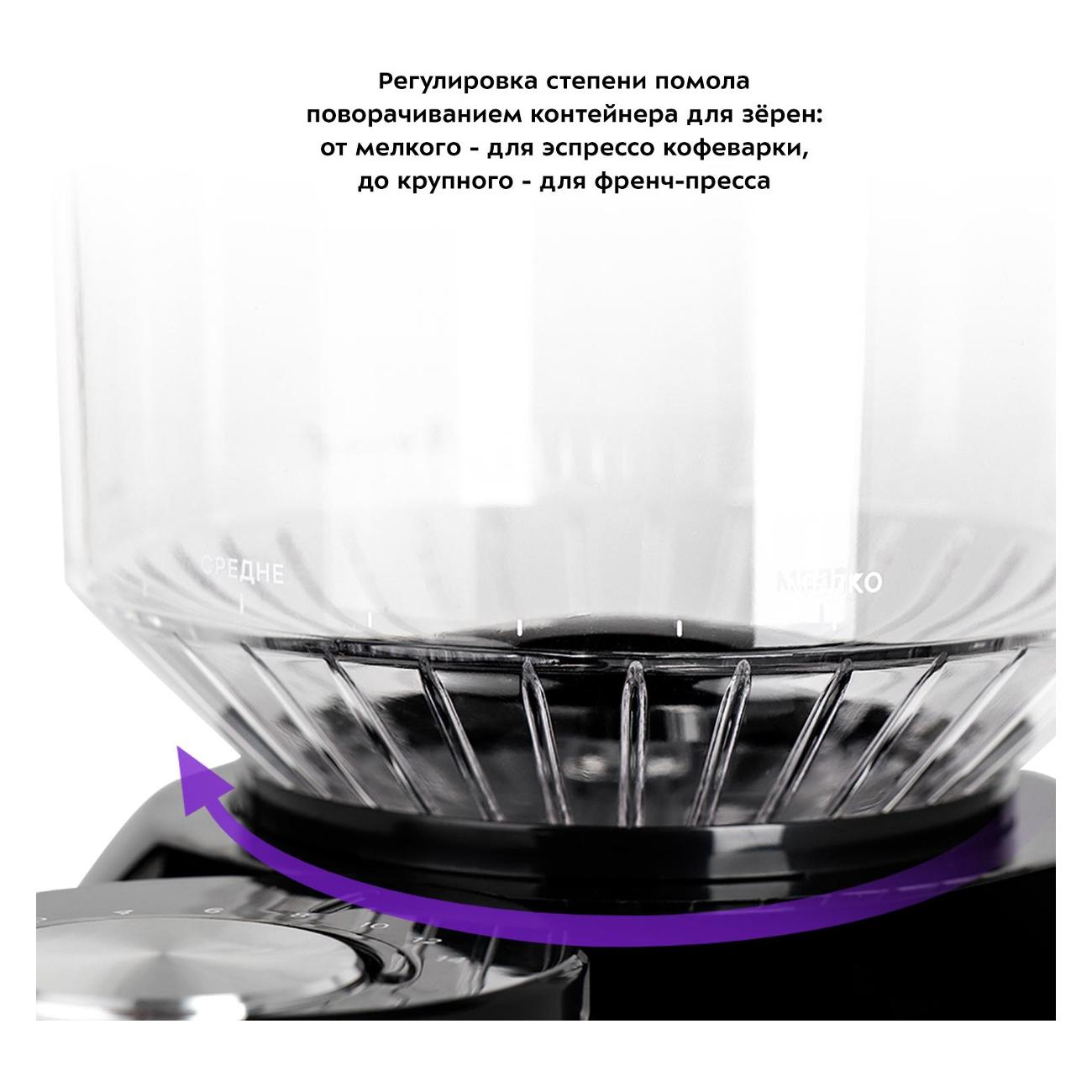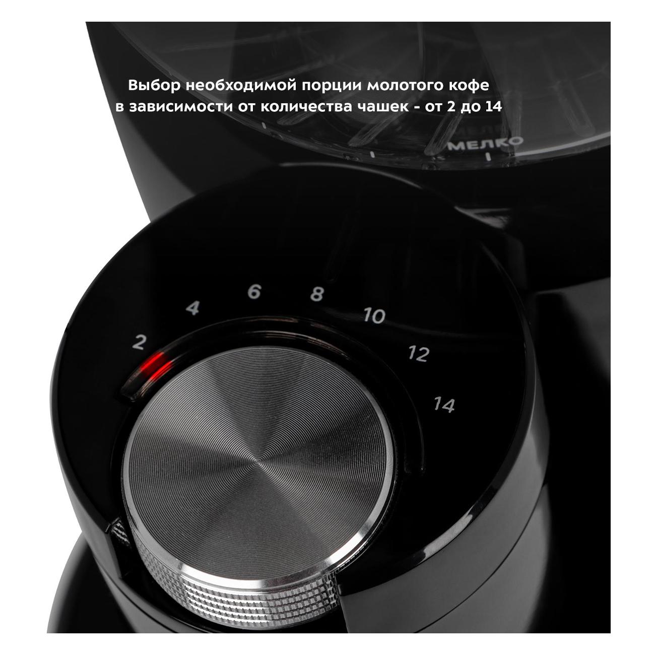 Уровень помола можно регулировать при помощи переключателя, как и количество чашек: от двух до 14. Контейнеры и внешний жернов легко снимаются для очистки. Мощность прибора составляет 150 Вт, длина сетевого провода — 1 м. Вес кофемолки — 1,3 кг.