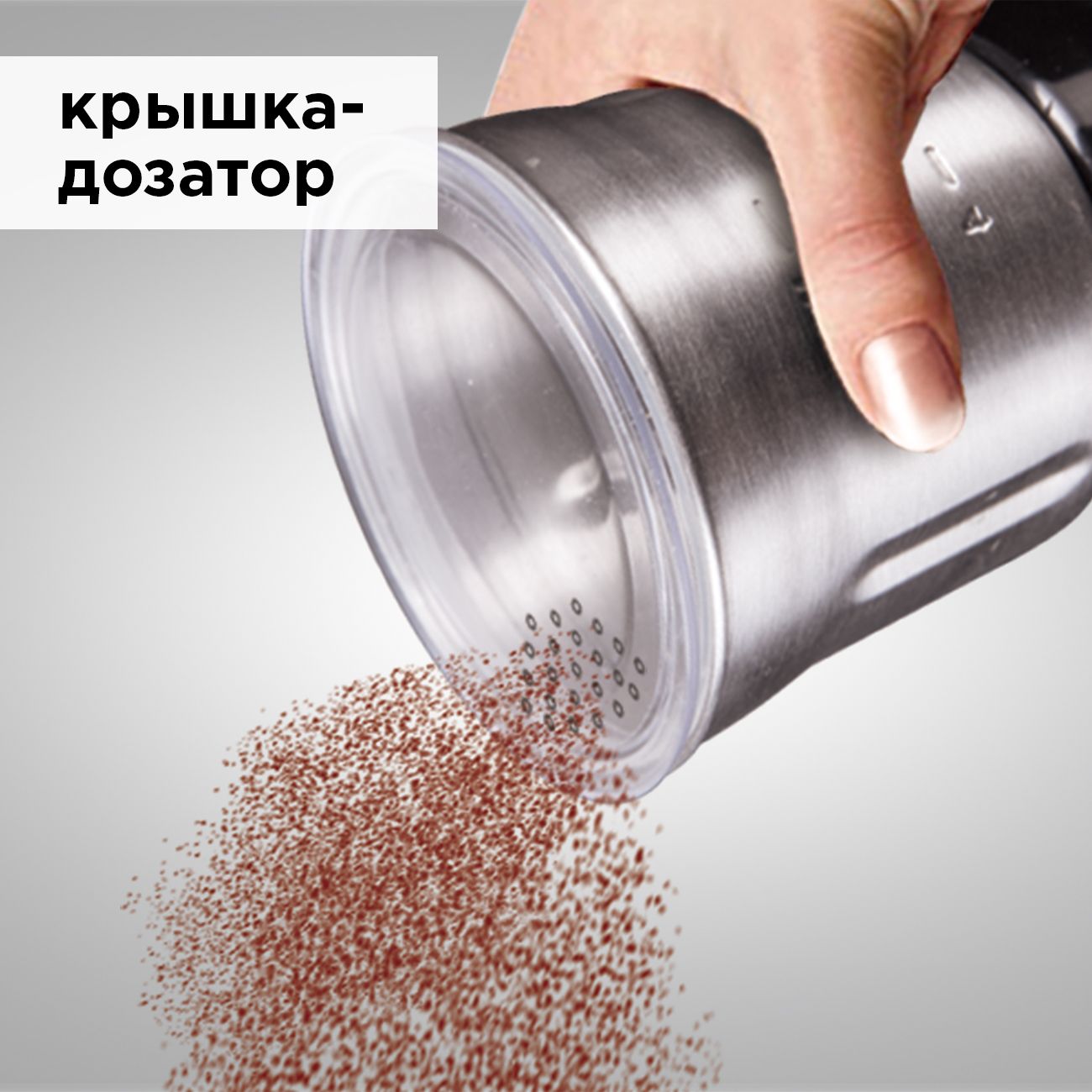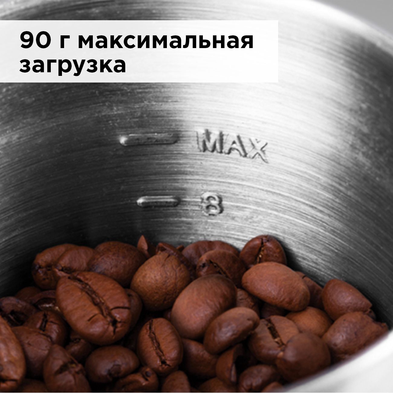 • Вместимость 90 г: позволяет смолоть порцию сразу на несколько чашек, что удобно дома и при приготовлении кофе для компании.