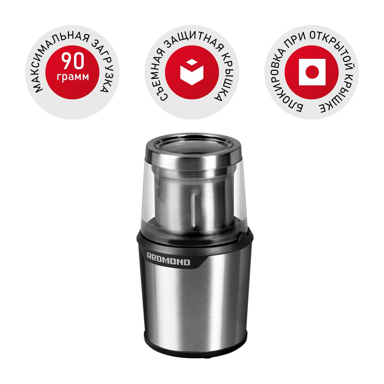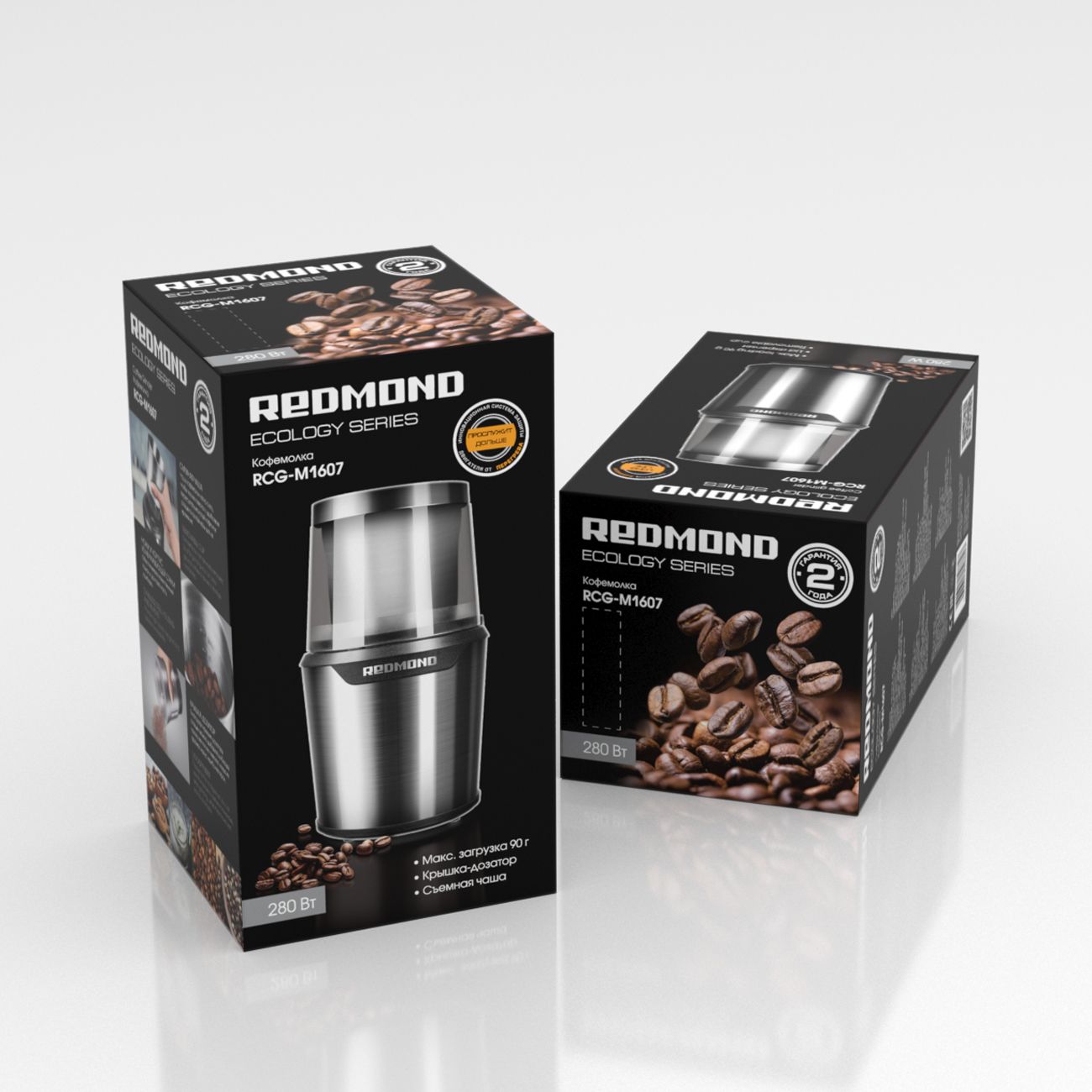 Кофемолка Redmond RCG-M1607 с мощностью 280 Вт рассчитана на загрузку до 90 г кофейных зёрен. Корпус выполнен из пластика и нержавеющей стали, чаша и резервуар — из нержавеющей стали.