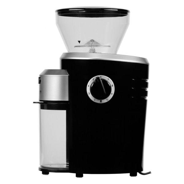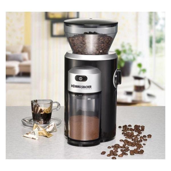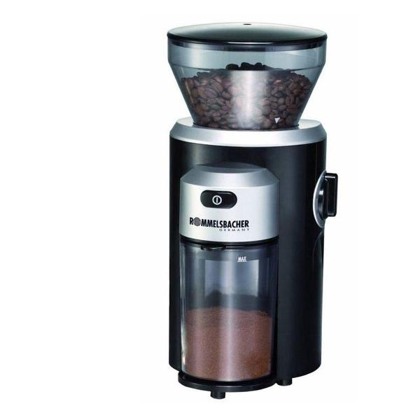 Кофемолка Rommelsbacher EKM 300, черная, обеспечивает помол кофе различного купажа и обжарки за счет встроенных стальных жерновов. Корпус изготовлен из пластика и металла и оснащен устойчивыми прорезиненными ножками. Также в наличии отсек для хранения сетевого кабеля. Система управления представлена кнопкой включения и поворотными регуляторами выбора степени помола (их 12). В наличии два пластиковых съемных контейнера для кофе: для зернового объемом 220 г и для молотого объемом 120 г.