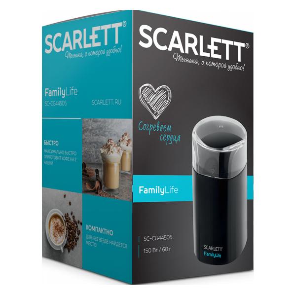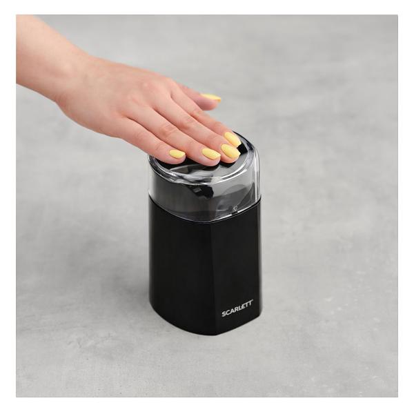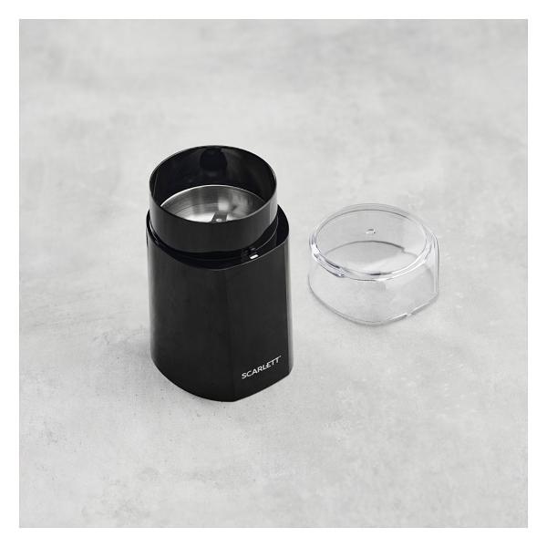 Кофемолка Scarlett SC-CG44505 черного цвета обладает массой 500 г. Габариты устройства составляют 14х8,5х9,5 см. Уровень потребляемой мощности не превышает 160 Вт. Длина кабеля питания — 90 см. Корпус изготовлен из пластика, лезвия — из нержавеющей стали. В приборе присутствует резервуар для кофе.
