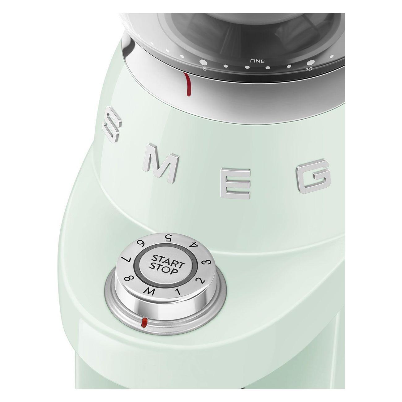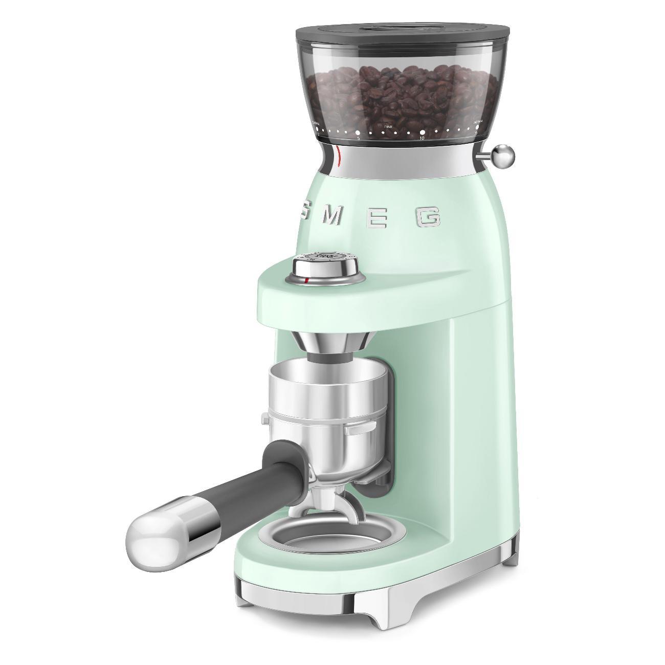 Кофемолка Smeg CGF03PGEU — жерновая модель в мятном цвете с 15 степенями помола и аксессуарами для рожка кофемашины ⌀58 мм.