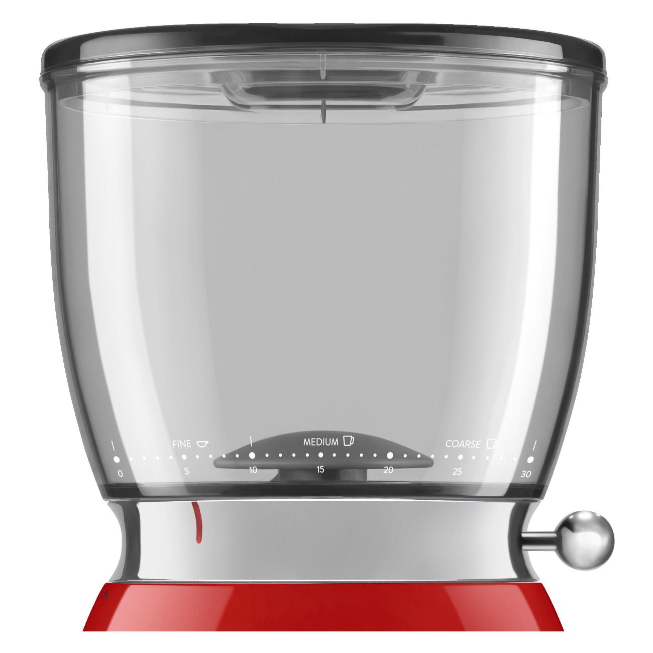 Кофемолка Smeg CGF11RDEU — жерновая модель в красном корпусе из нержавеющей стали с бункером для зерен на 350 г и контейнером для молотого кофе на 130 г.