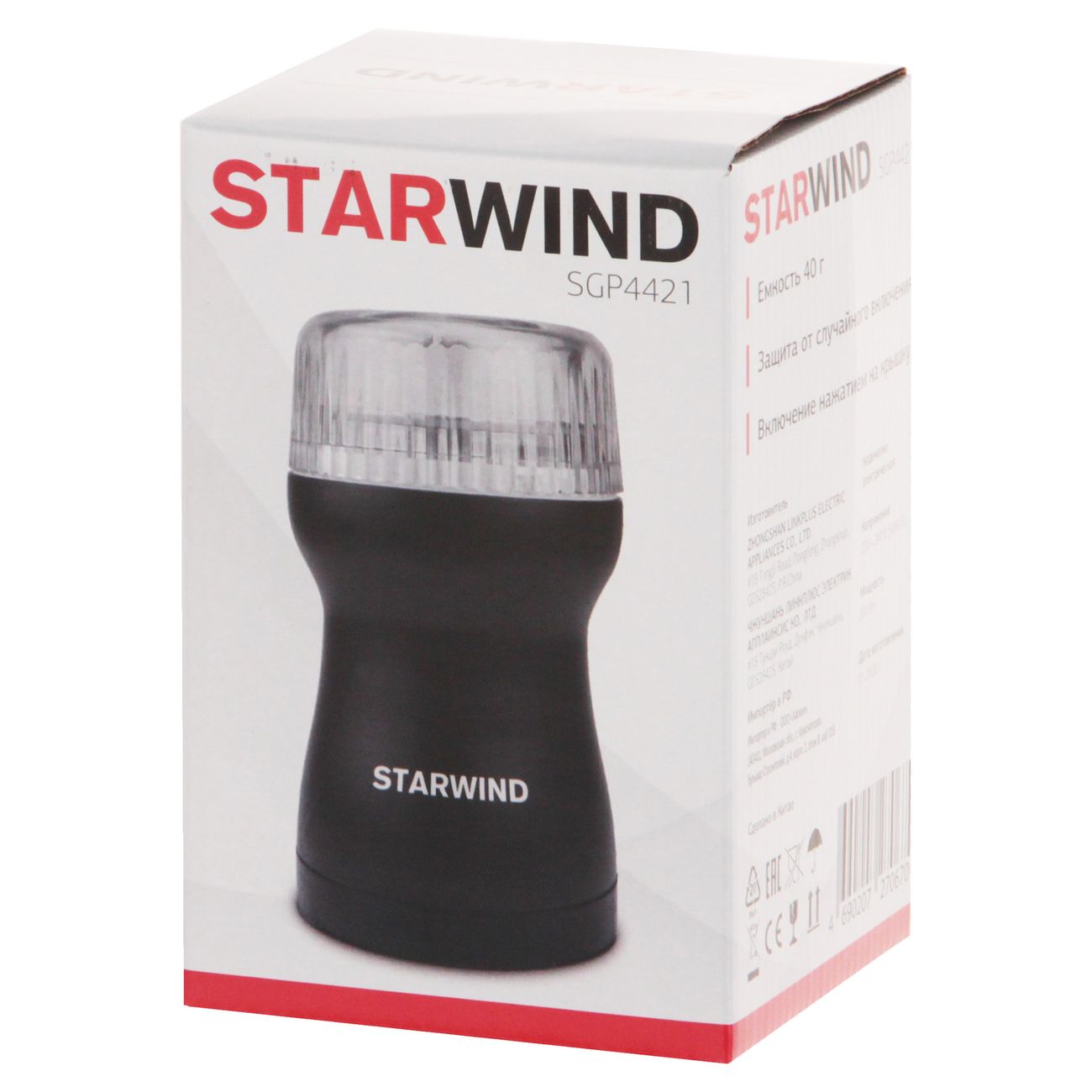 Кофемолка Starwind SGP4421 мощностью 200 Вт способна измельчить около 40 г кофейных зерен за один раз. Внутренняя часть изготовлена из нержавеющей стали, материал не впитывает запах, так что кофемолка подходит для измельчения специй, орехов. Интенсивность помола регулируется длительностью работы прибора, рекомендуется осуществлять измельчение импульсно. Для безопасности предусмотрена защита от включения при открытой крышке. Длина провода составляет 1 м.