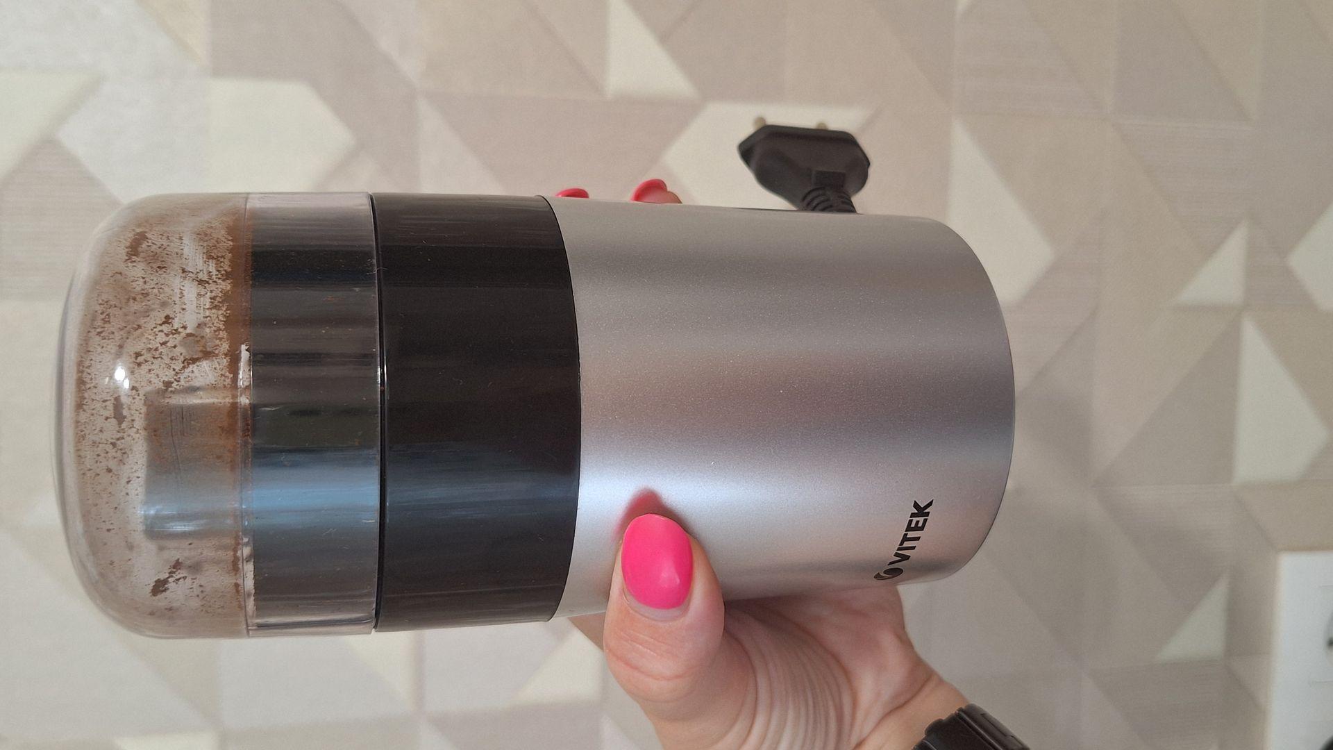 Кофемолка Vitek очень компактная, универсально цвета. Очень нравится ,что крышка ,где идёт помол зёрен прозрачная, так очень хорошо видно степень помола . Объем для помола достаточный, даже при желании можно на один раз 10 зёрен смолоть ,все идеально. Ещё большой плюс в том ,что шнур прячется внутрь кофемолки при повороте корпуса.