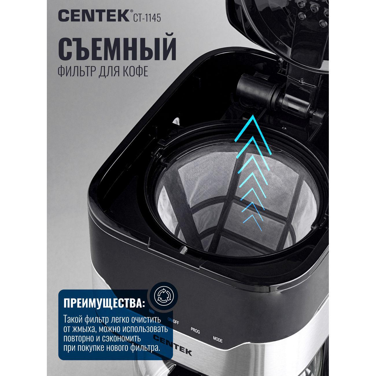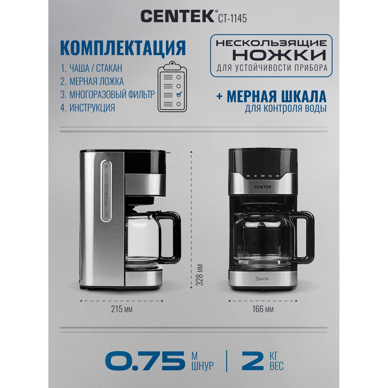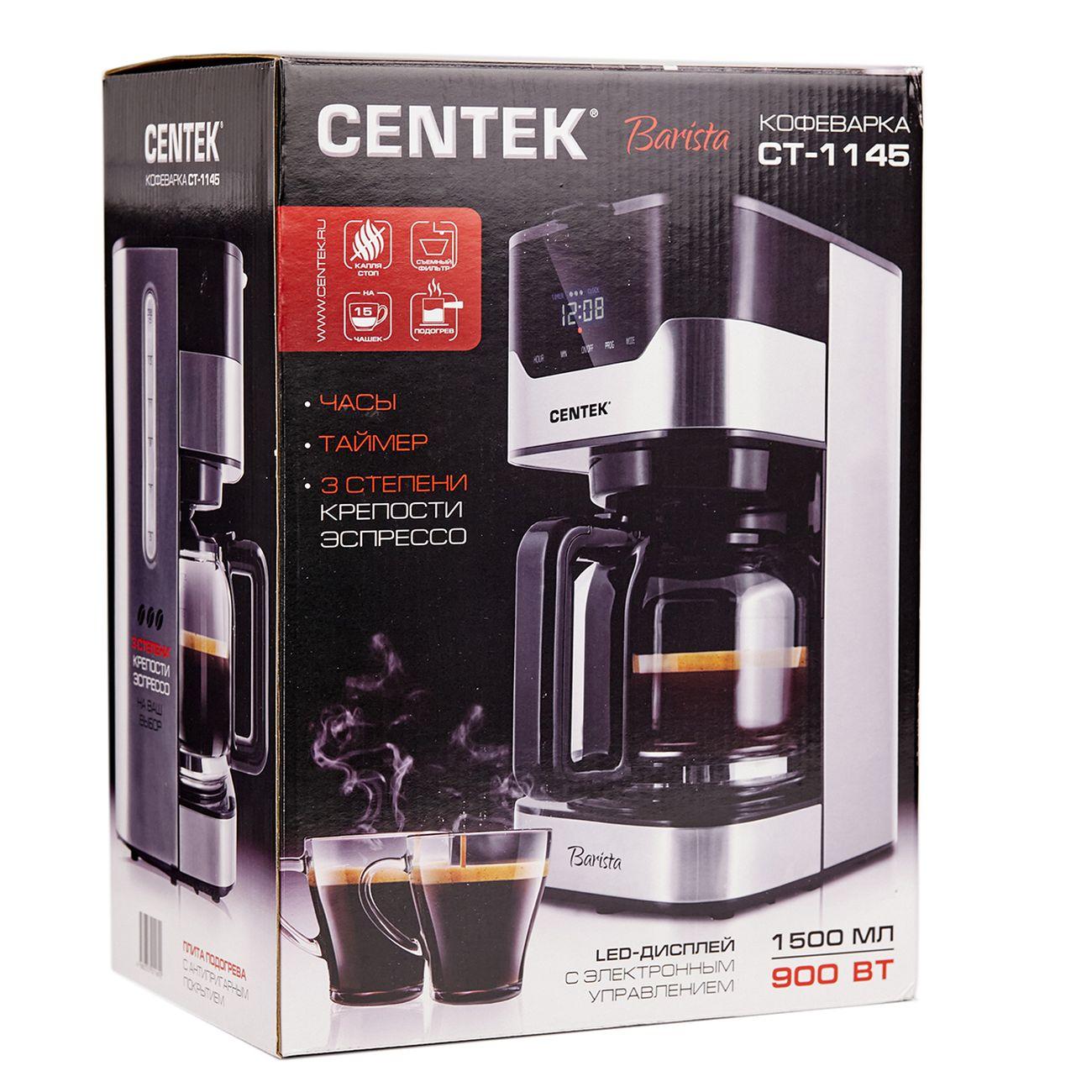 Вы можете купить Кофеварка капельного типа Centek CT-1145 в магазинах М.Видео по доступной цене. Кофеварка капельного типа Centek CT-1145: подробное описание, фото и отзывы реальных покупателей, характеристики, возможность скачать инструкции и подобрать аксессуары.