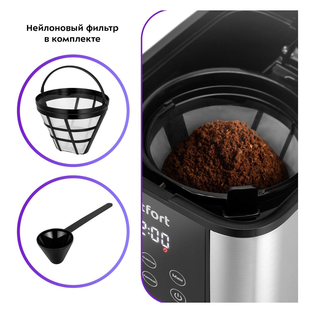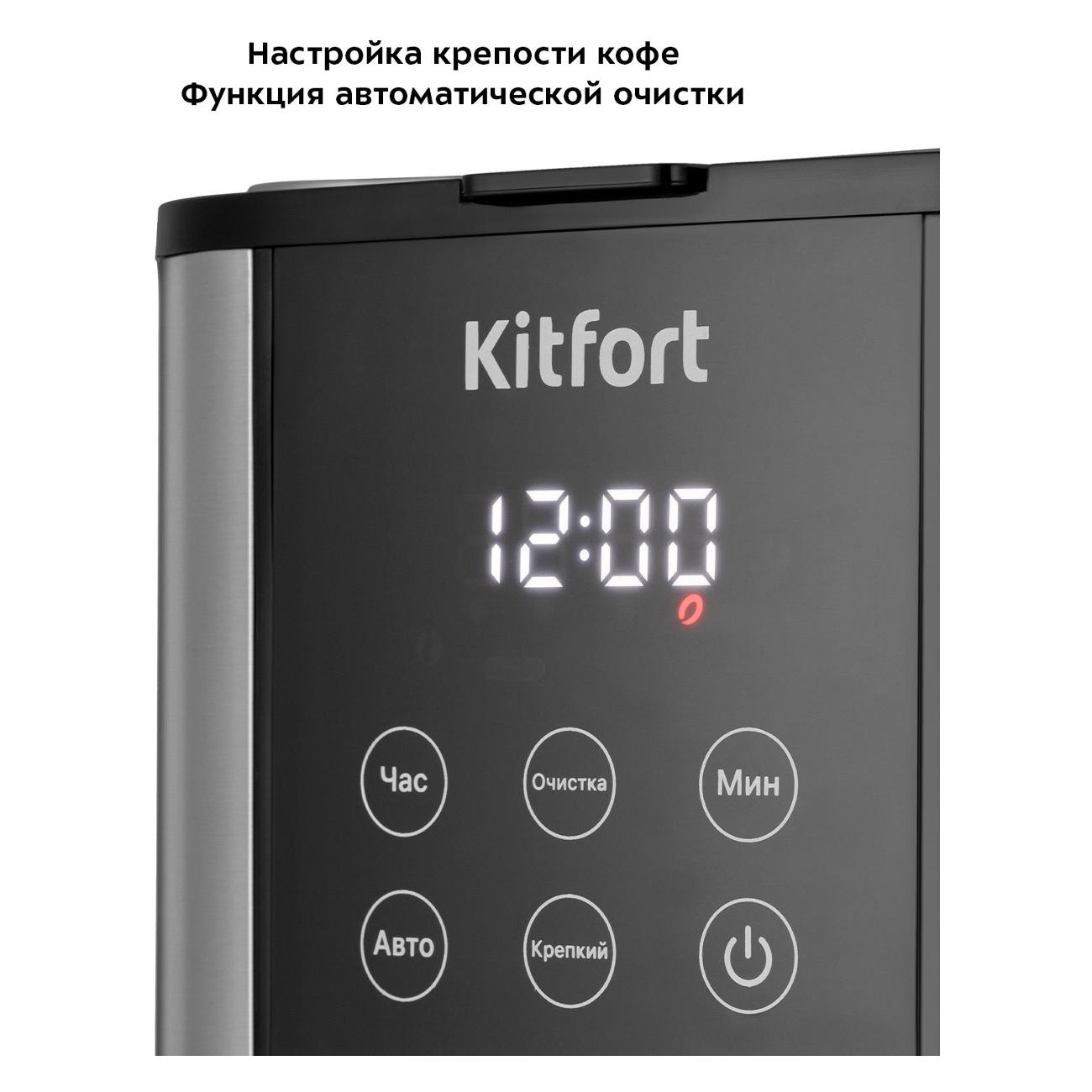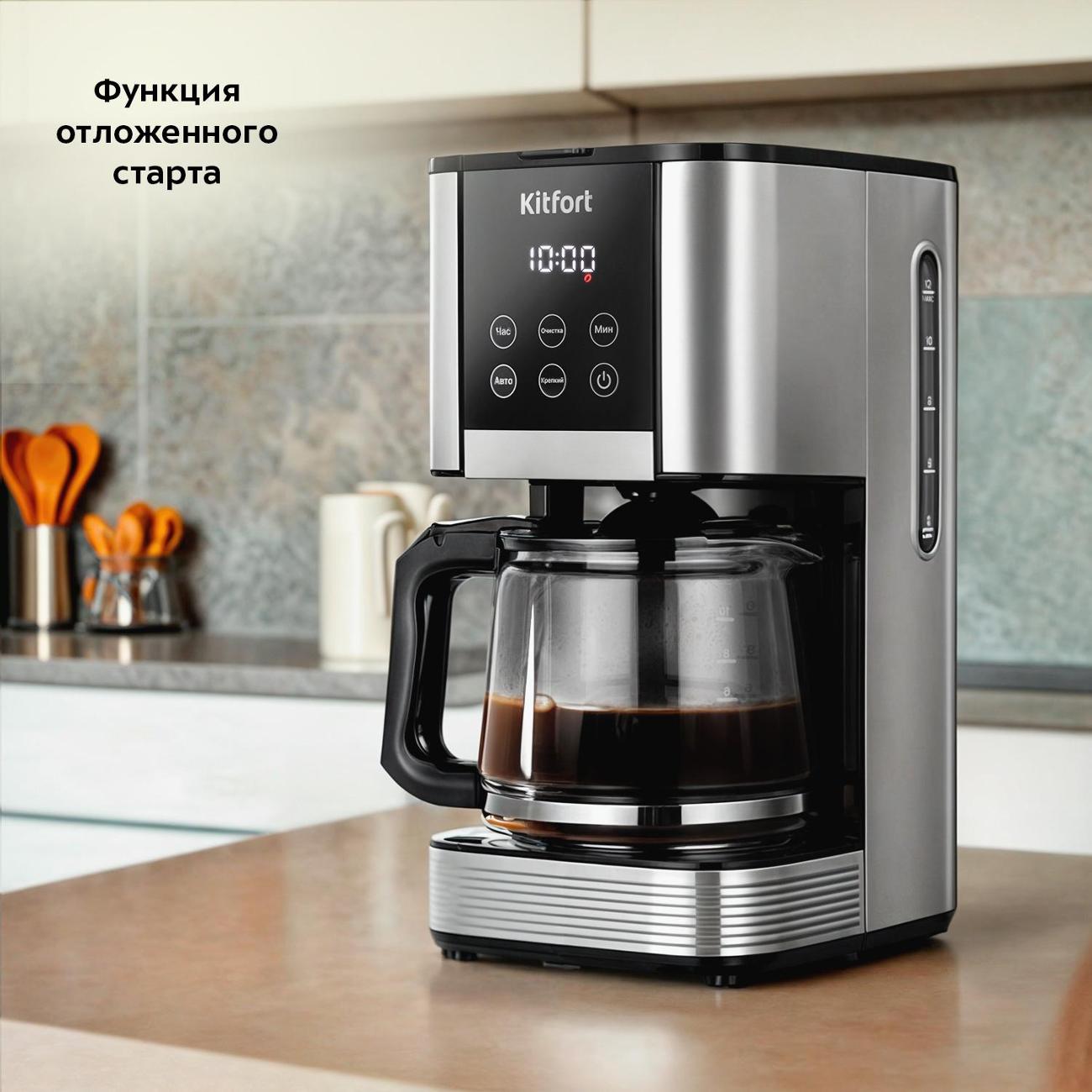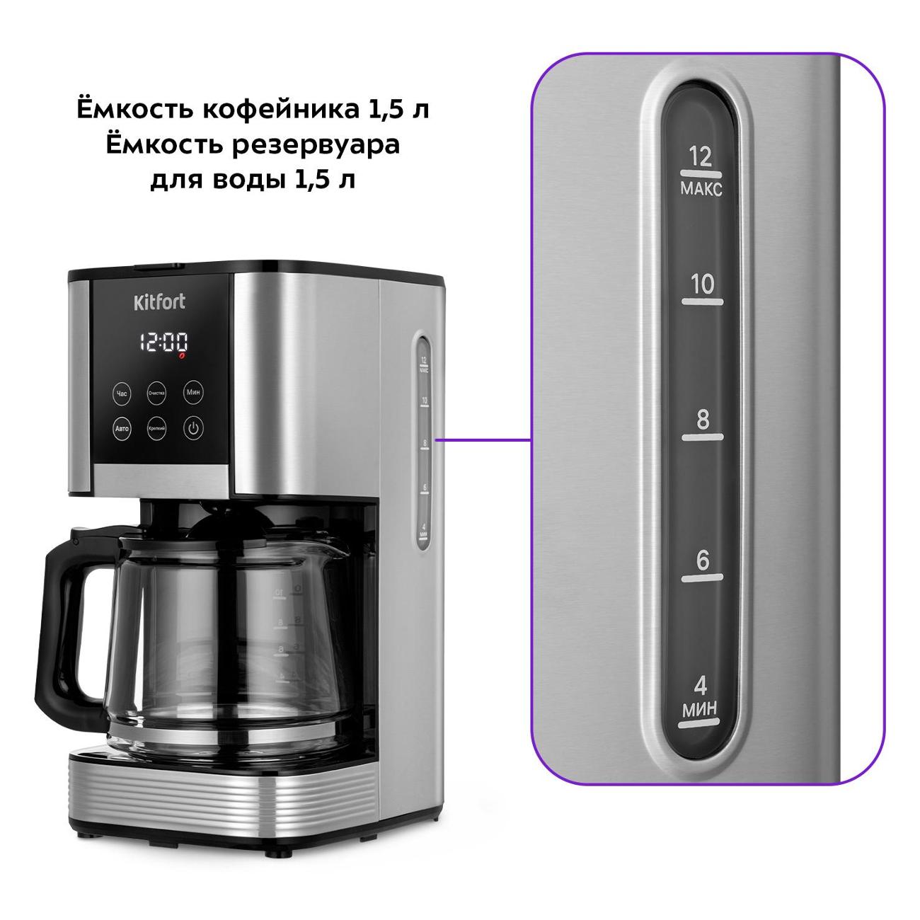 Кофеварка капельного типа Kitfort КТ-7222 с регулировкой крепости кофе поддерживает выбор интенсивности вкуса напитка. Модель выполнена в серебристо-черном цвете и оснащена колбой объемом 1,5 л.