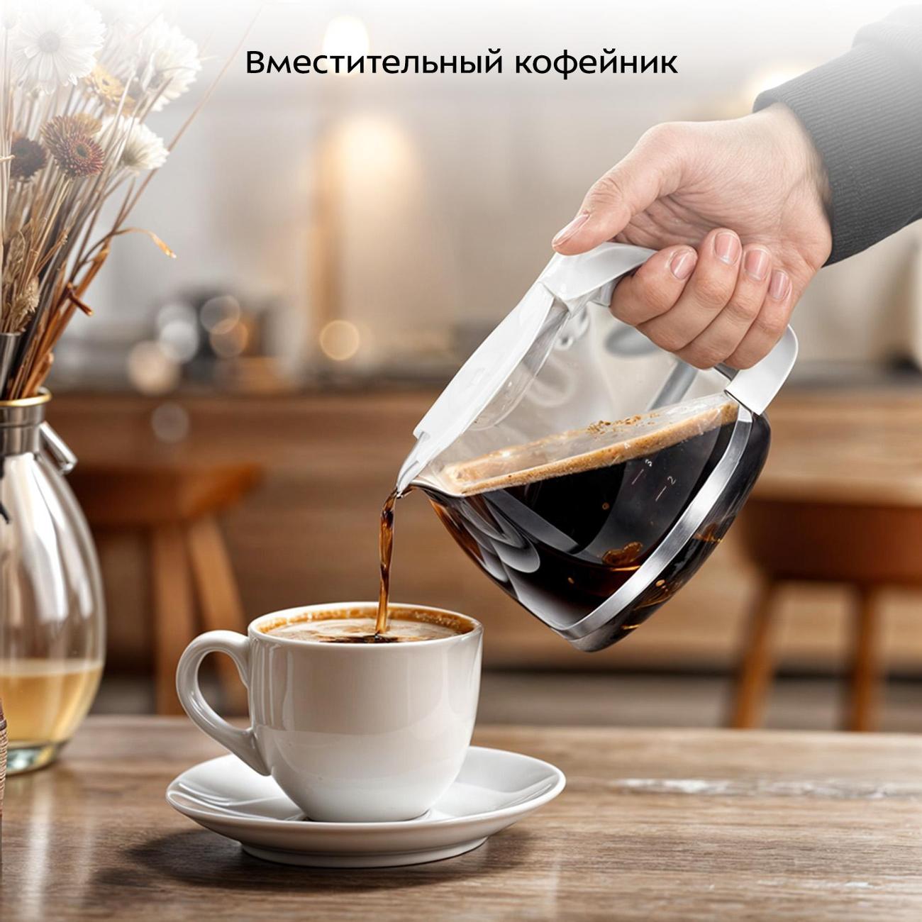Модель рассчитана на приготовление до 12 чашек за раз и удобна для регулярного использования благодаря таймеру, функциям поддержания температуры и простому уходу за фильтром.