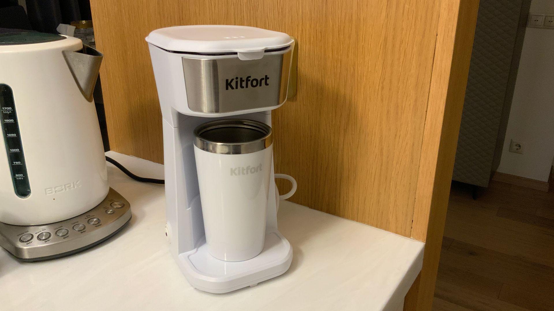 Кофеварка капельного типа Kitfort КТ-7411 . Главный плюс это компактность . Искал именно такую на работу . Очень удобно , что кофе наливается сразу в стакан . Который в комплекте термосок очень даже приличный . Пластик нормальный , мягкий , не будет ломаться . Продлевается кофе не так быстро , что хорошо - кофе успевает распариться . Но я завариваю в два этапа . Включаю на 30 секунд , и как только начинает капать выключаю и жду 2 минуты , и потом уже включаю. Так кофе крепче . Авто отключение работает четко . Через 5 минут отключает после готовки . На работе подогрев не нужен .думаю для дома тоже неплохая кофеварка. Качество , сборка на хорошем уровне .