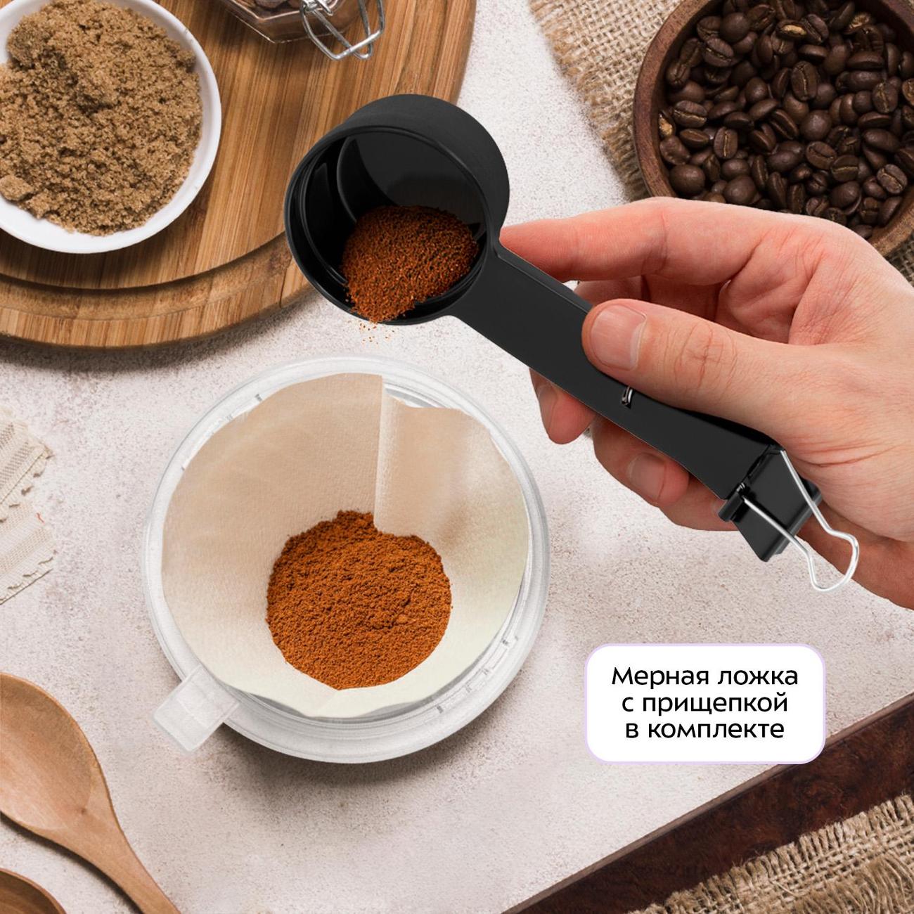 • Мерная ложка в комплекте — помогает отмерять нужное количество молотого кофе.