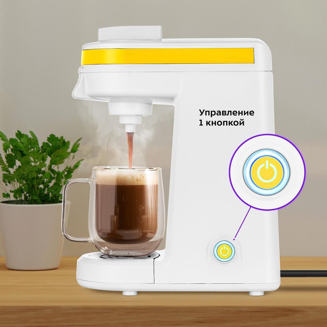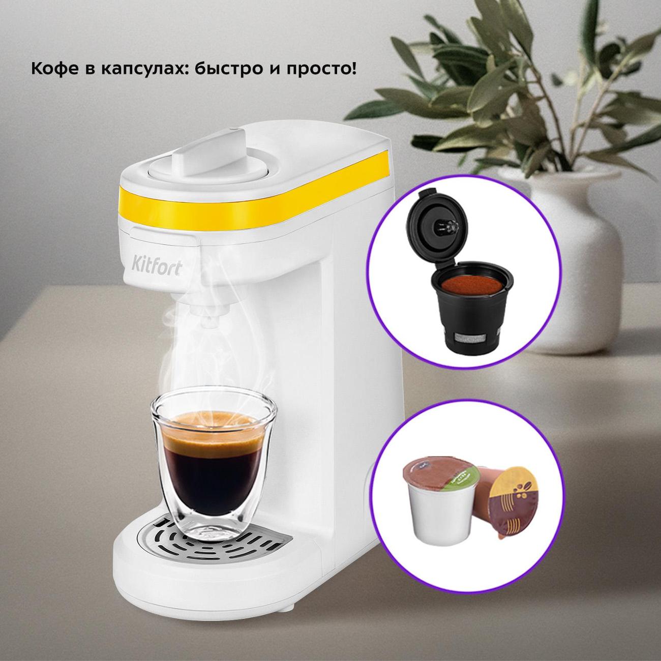 Кофеварка капсульного типа Kitfort КТ-7122-3 поддерживает приготовление кофе из капсул и молотого кофе и выполнена в бело-жёлтом цвете. Компактная модель весом 1,168 кг подходит для размещения даже на небольшой кухне.