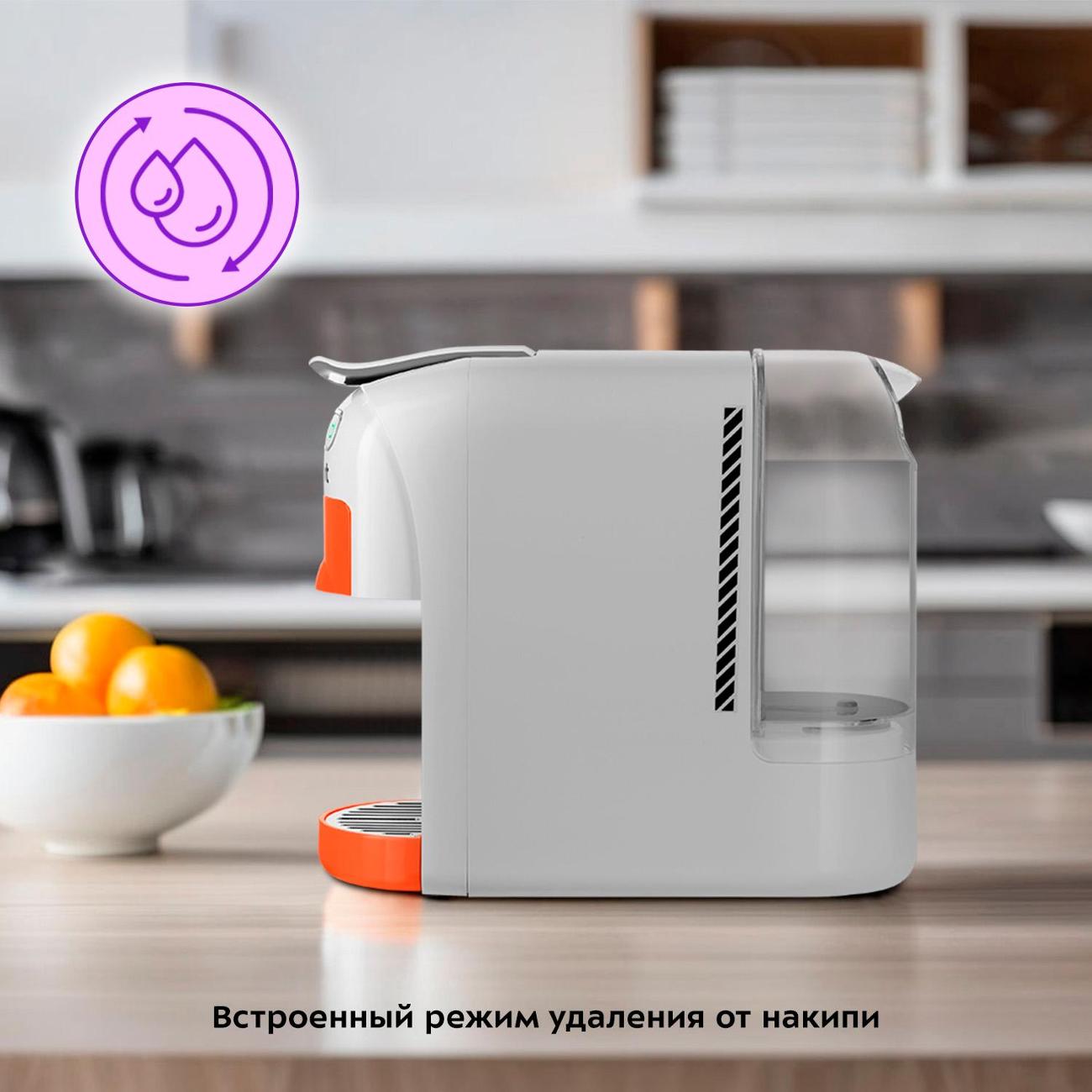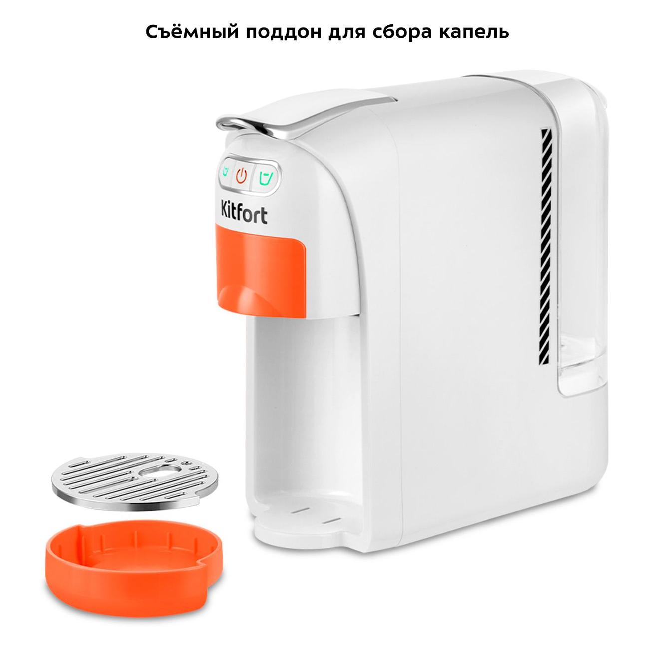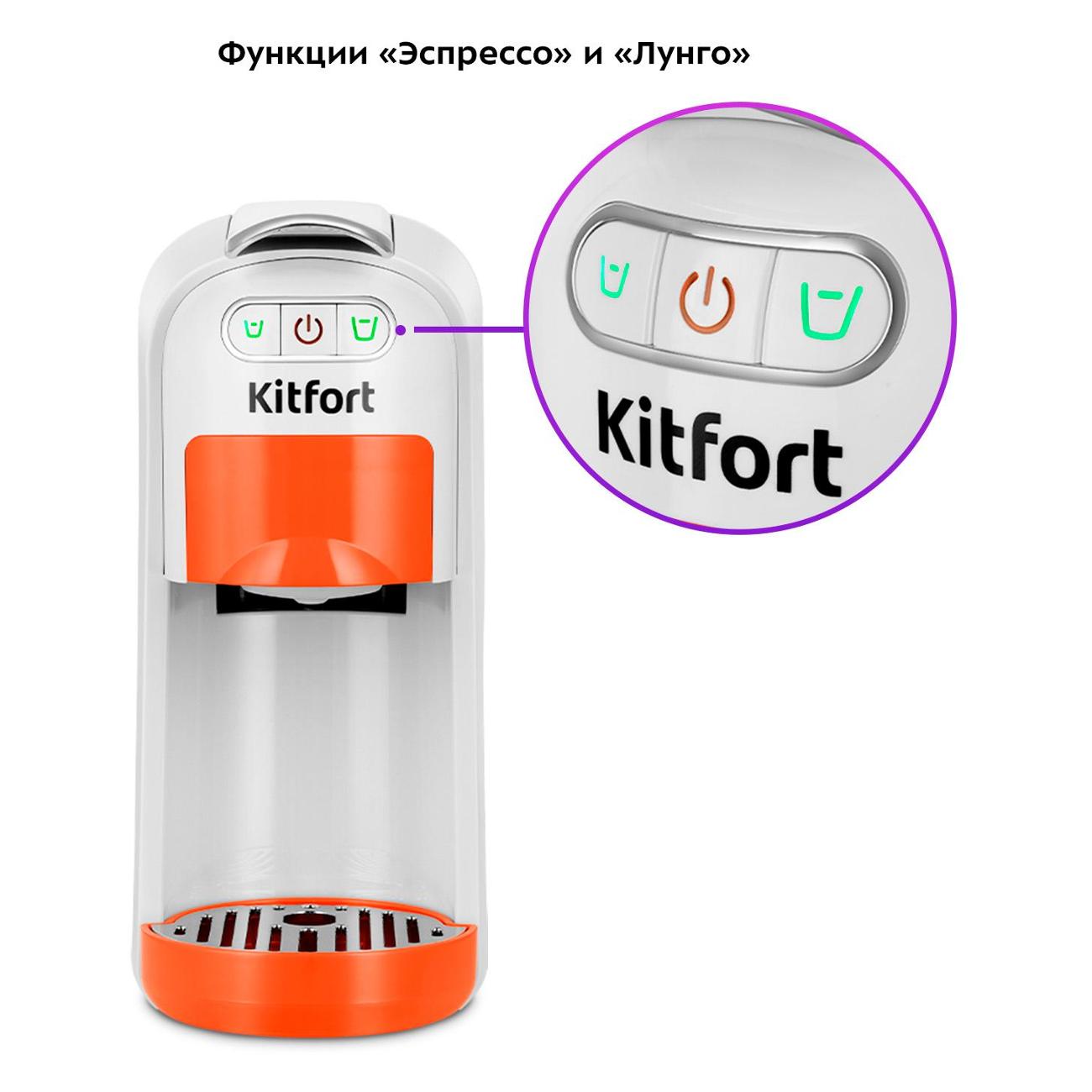 Кофеварка капсульного типа Kitfort КТ-7509 поддерживает две системы капсул — Nespresso и Dolce Gusto — в одном устройстве и выполнена в бело-оранжевом цвете. Модель поддерживает приготовление напитков из молотого кофе.
