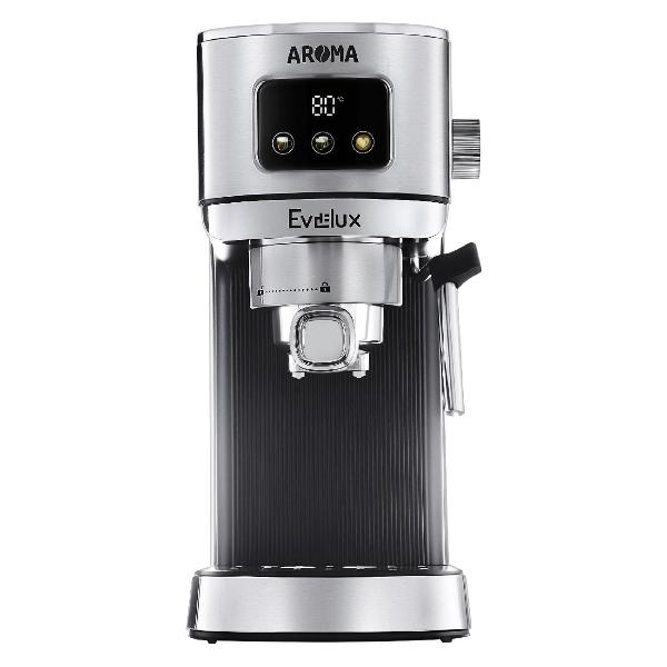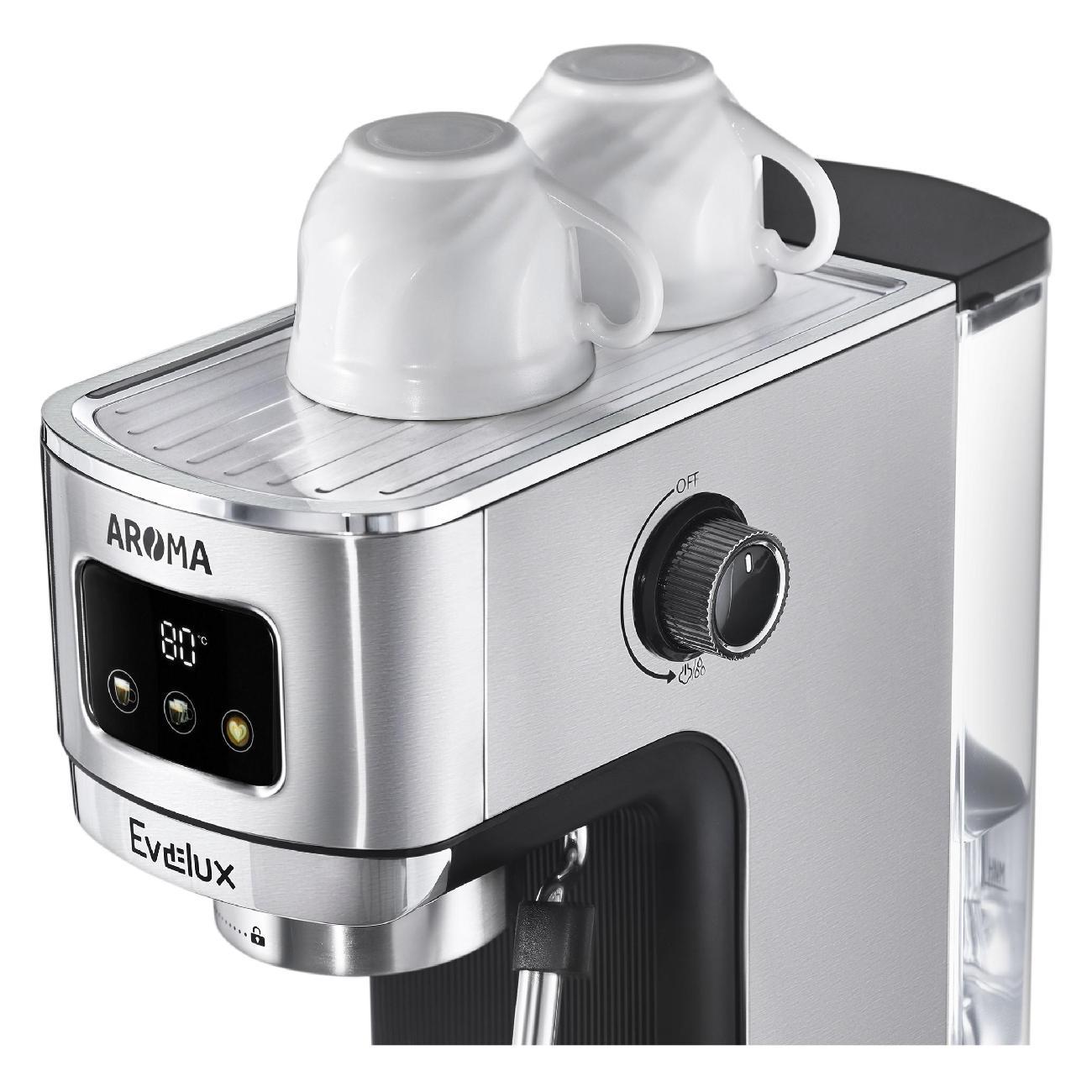 Кофеварка рожкового типа Evelux ECM 1009 Aroma с давлением до 20 бар выполнена в черно-серебристом цвете и рассчитана на резервуар для воды 1,2 л.