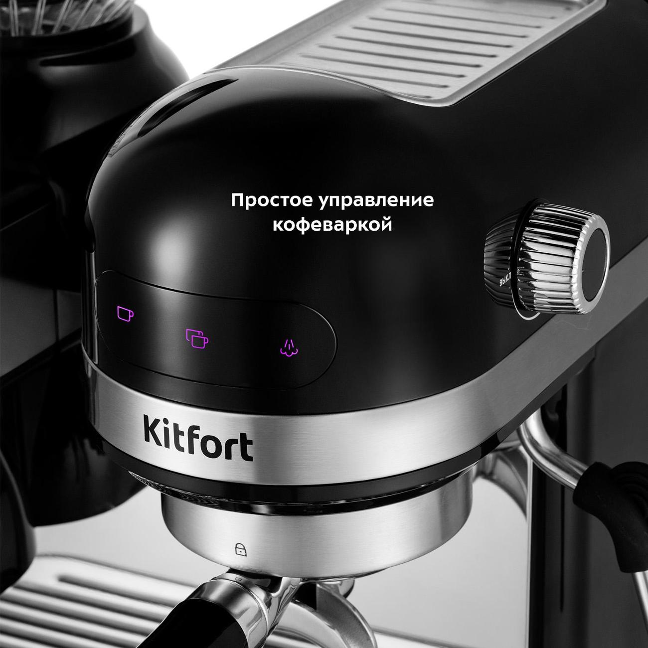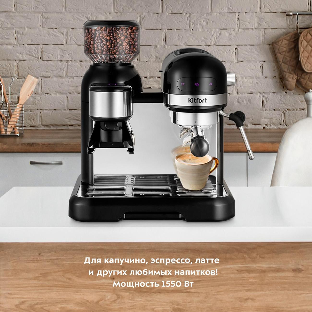 Кофеварка рожкового типа Kitfort КТ-7126 с давлением 19 бар и встроенной кофемолкой позволяет готовить напитки из свежемолотых зерен. Корпус выполнен из пластика и металла, цвет — черный.