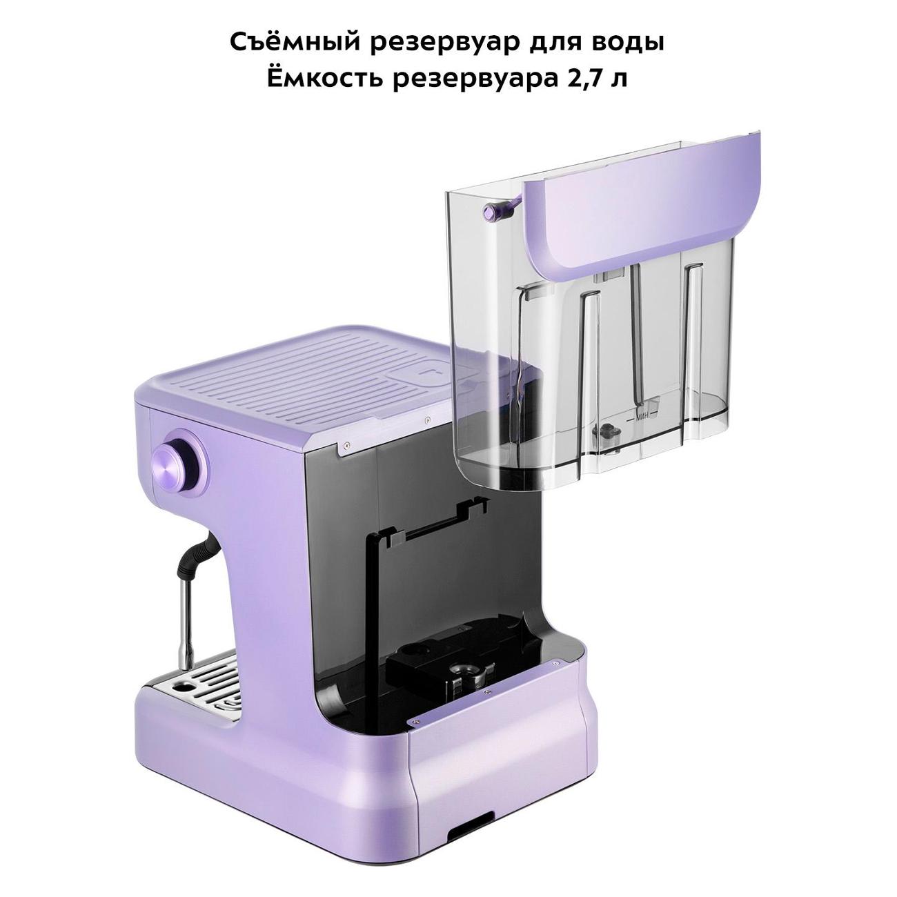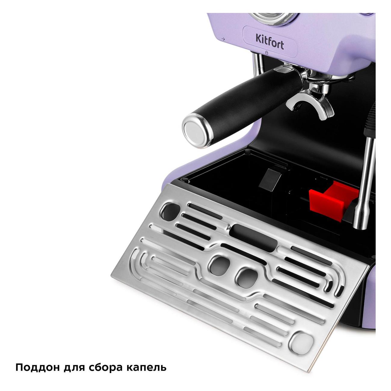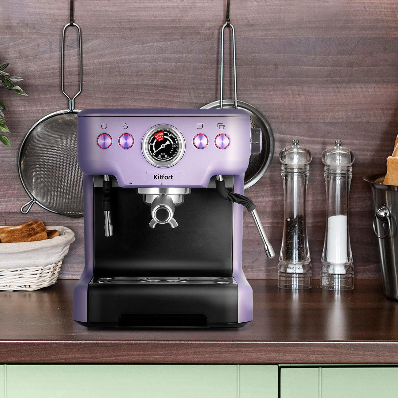Кофеварка рожкового типа Kitfort КТ-7171 — модель с максимальным давлением 20 бар, выполненная в черно-лавандовом цвете и с резервуаром для воды объемом 2,7 л. Предусмотрено приготовление эспрессо и напитков на его основе, подача горячего молока и кипятка.