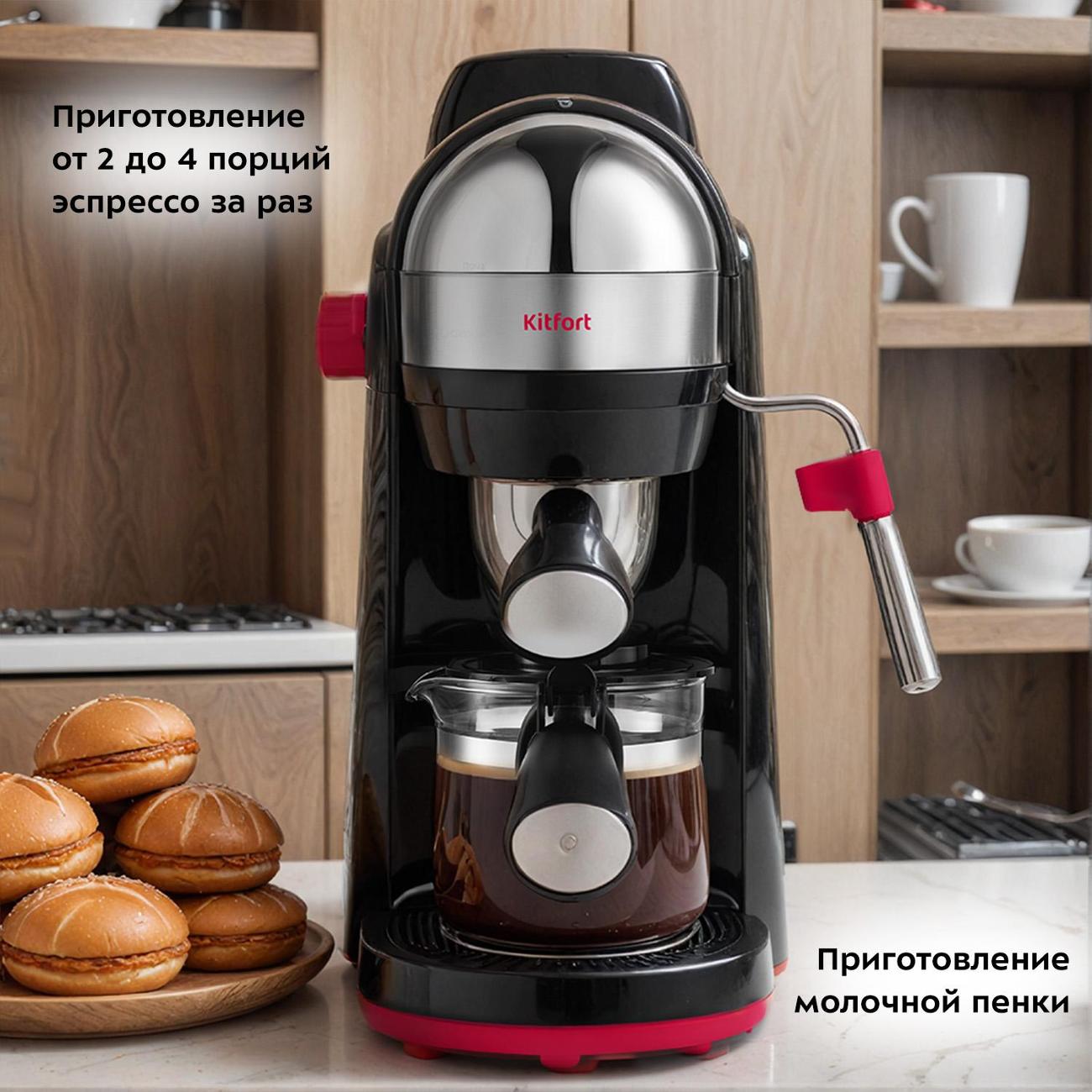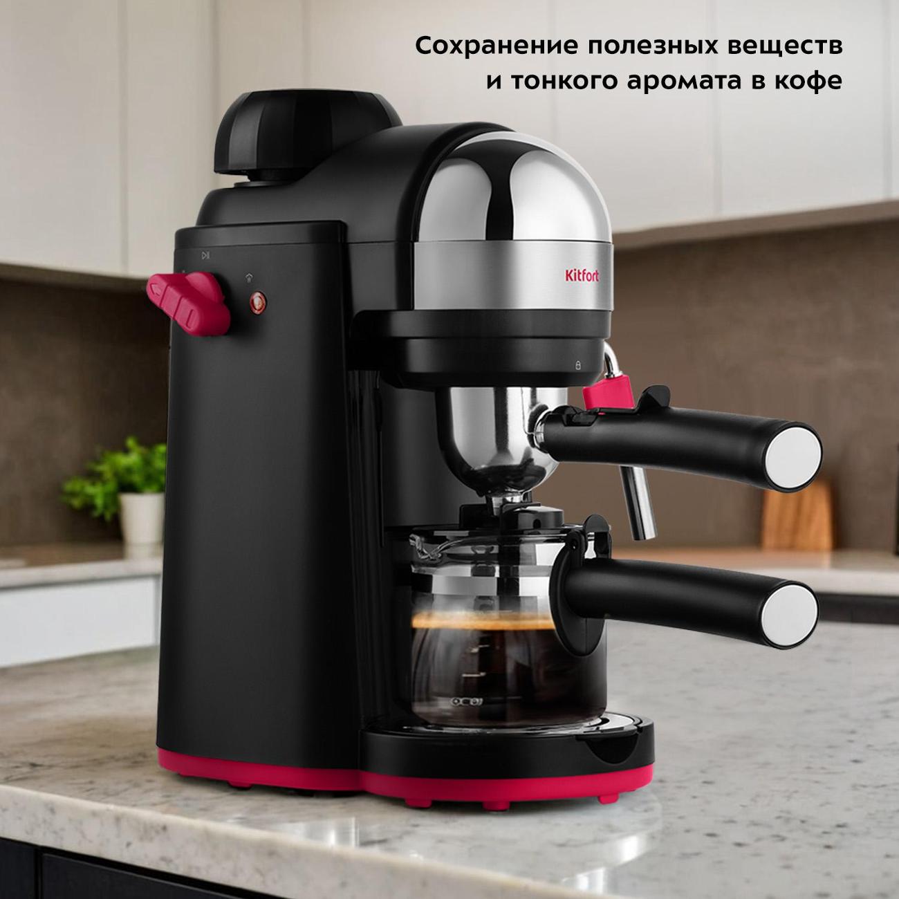 Кофеварка рожкового типа Kitfort КТ-7444 с автоматическим вспенивателем молока выполнена в черном цвете. Мощность — 800 Вт, вес — 1,84 кг.