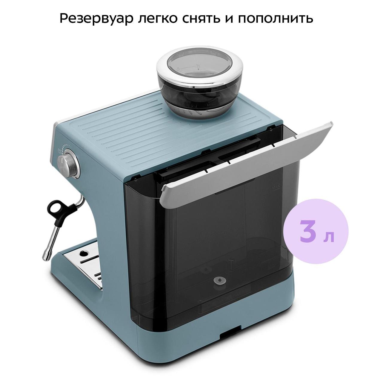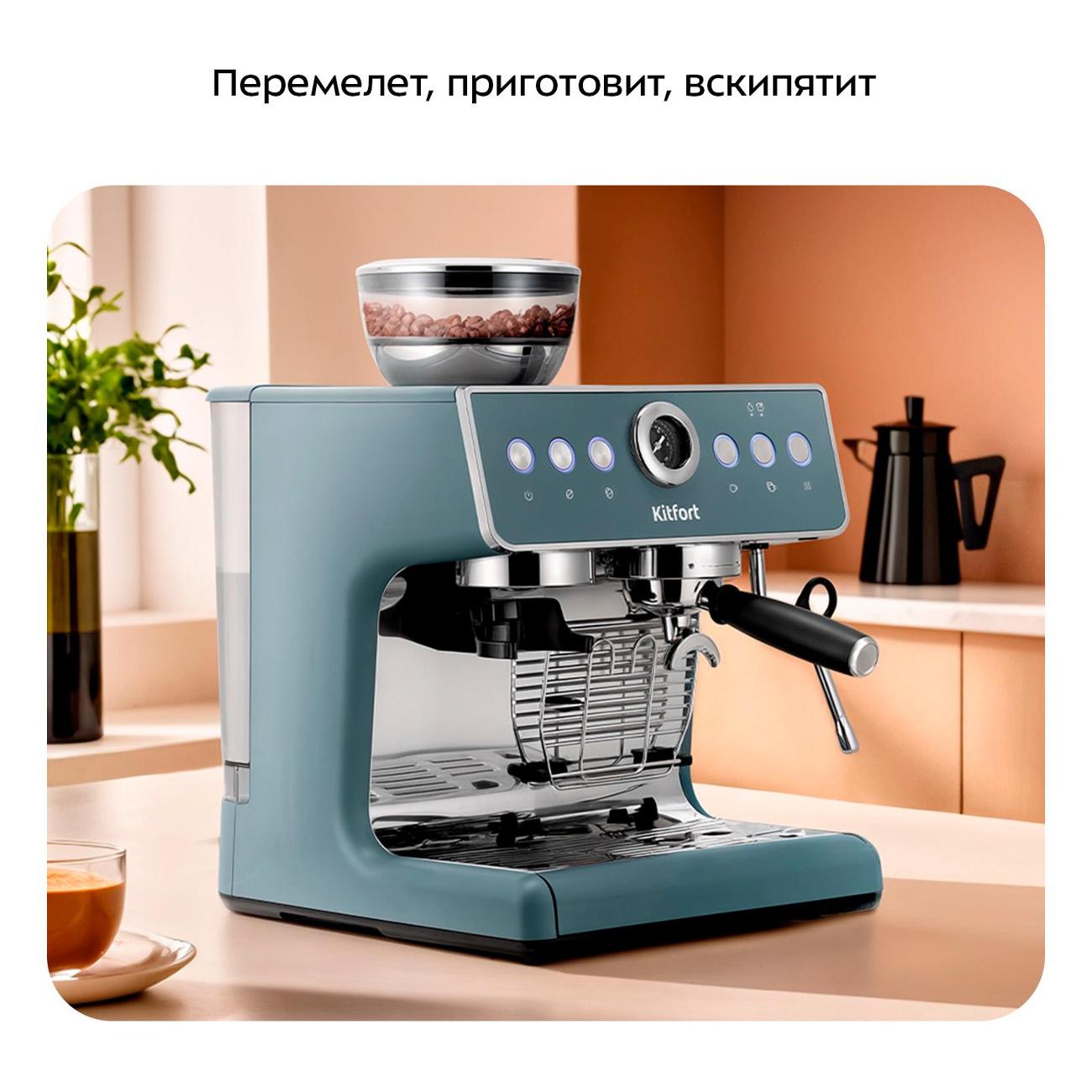 Кофеварка рожкового типа Kitfort КТ-7521 — модель в сером и голубом цветах с давлением 20 бар и автоматическим устройством для взбивания молока для приготовления кофейных напитков дома или в офисе.