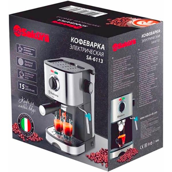 Кофеварка рожкового типа Sakura SA-6113 мощностью 850 Вт подает воду под давлением 15 Бар, что позволяет полностью раскрыть вкус и аромат кофе. Емкость для воды объемом 1 л дает возможность готовить до десяти порций кофе в зависимости от размера (две чашки можно ставить одновременно).