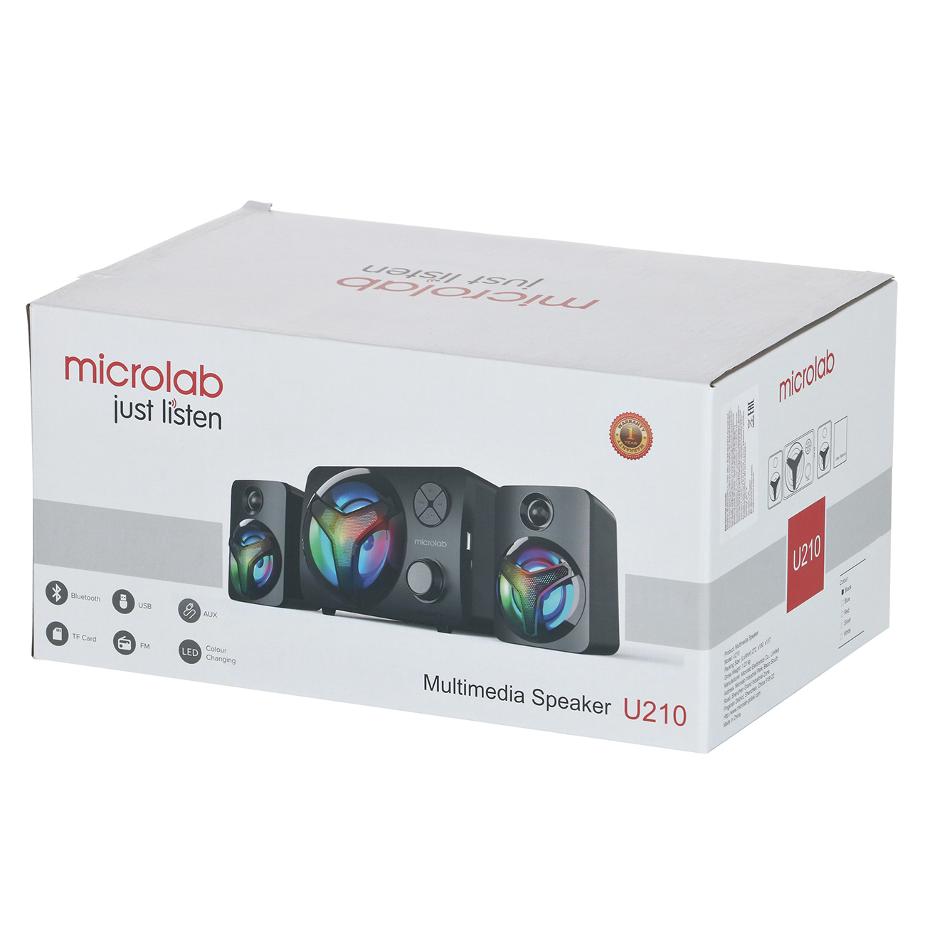 Компьютерные колонки 2.1 Microlab U210 оборудованы корпусом из пластика в черном цвете. Комплект включает в себя три колонки и сабвуфер мощностью 5 Вт. Колонки обладают мощностью 3 Вт каждая. Частотный диапазон воспроизведения звука составляет 45 Гц-18 кГц. Устройство соединяется с ПК при помощи беспроводного модуля Bluetooth и интерфейса Jack 3,5 мм. Данная модель оснащена беспроводным управлением и функцией регулировки громкости. Прорезиненные ножки предохраняют поверхность стола от повреждений.