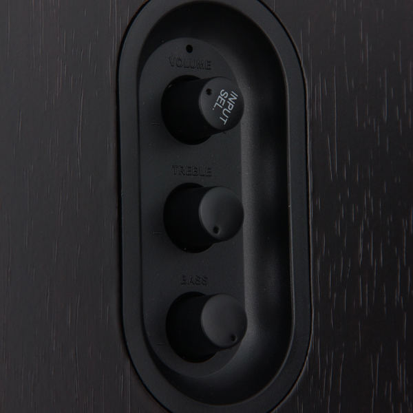 В комплект входит пульт дистанционного управления, но разработчики предусмотрели и блок управления уровнем громкости, а также балансом высоких и низких частот, вынесенный на боковую панель активного громкоговорителя.