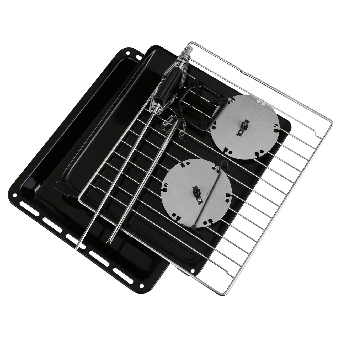 Плита снабжена большой электрической духовкой с грилем и конвектором. Она позволяет готовить множество блюд – от маленьких пирожных до больших кусков мяса и целой курицы. К ней прилагаются вертел и шашлычница. Электромеханический привод вращения обеспечивает равномерную прожарку, а встроенный термостат поддерживает постоянную температуру, защищая продукты от пригорания.