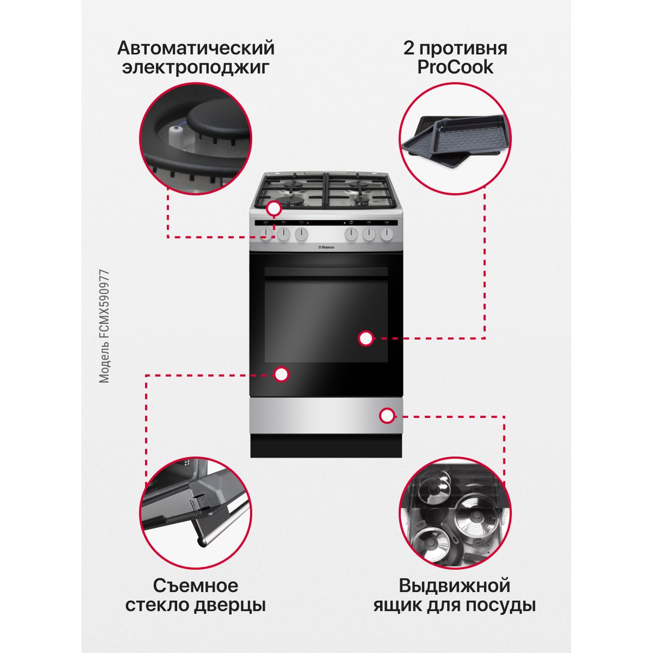 Комбинированная плита Hansa FCMX590977 даёт возможность быстро приготовить большое количество пищи. Четыре газовых конфорки дополнены вместительной электрической духовкой, поэтому вы можете воплотить в реальность различные кулинарные замыслы.