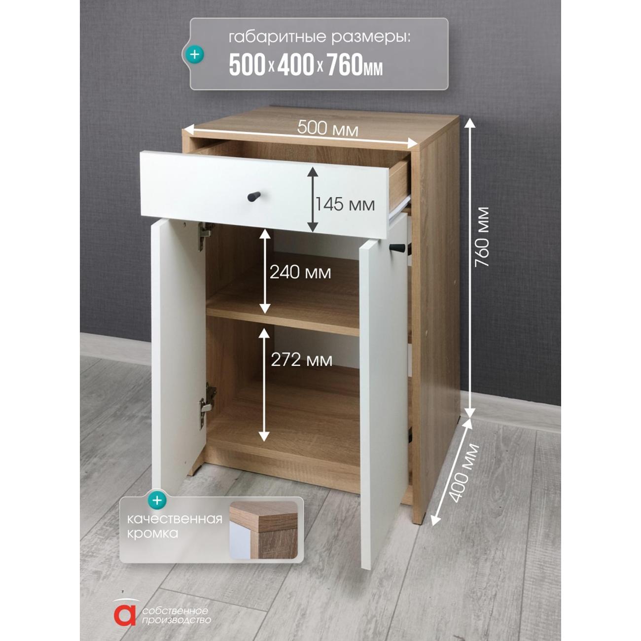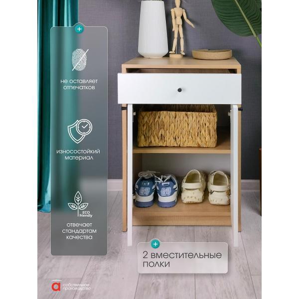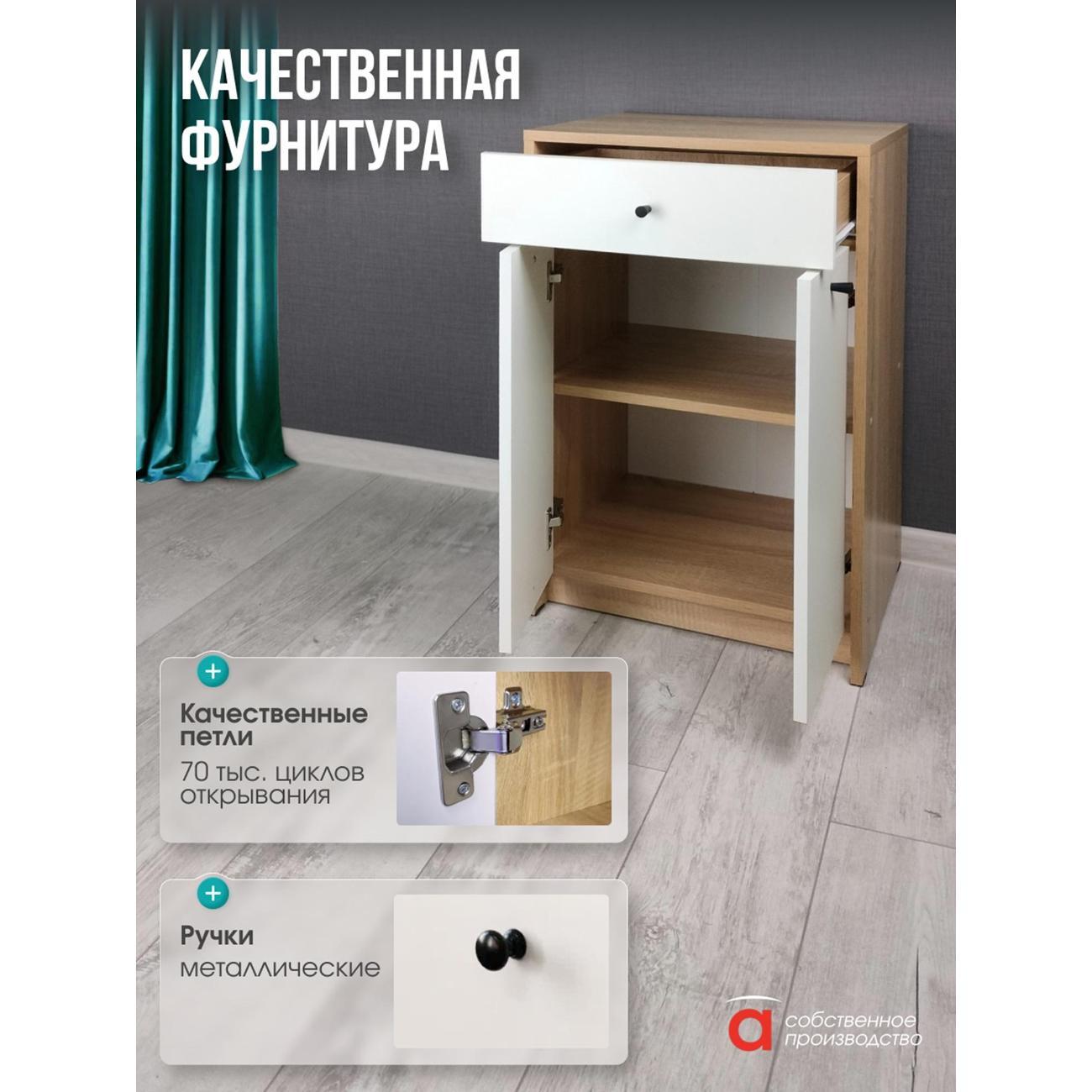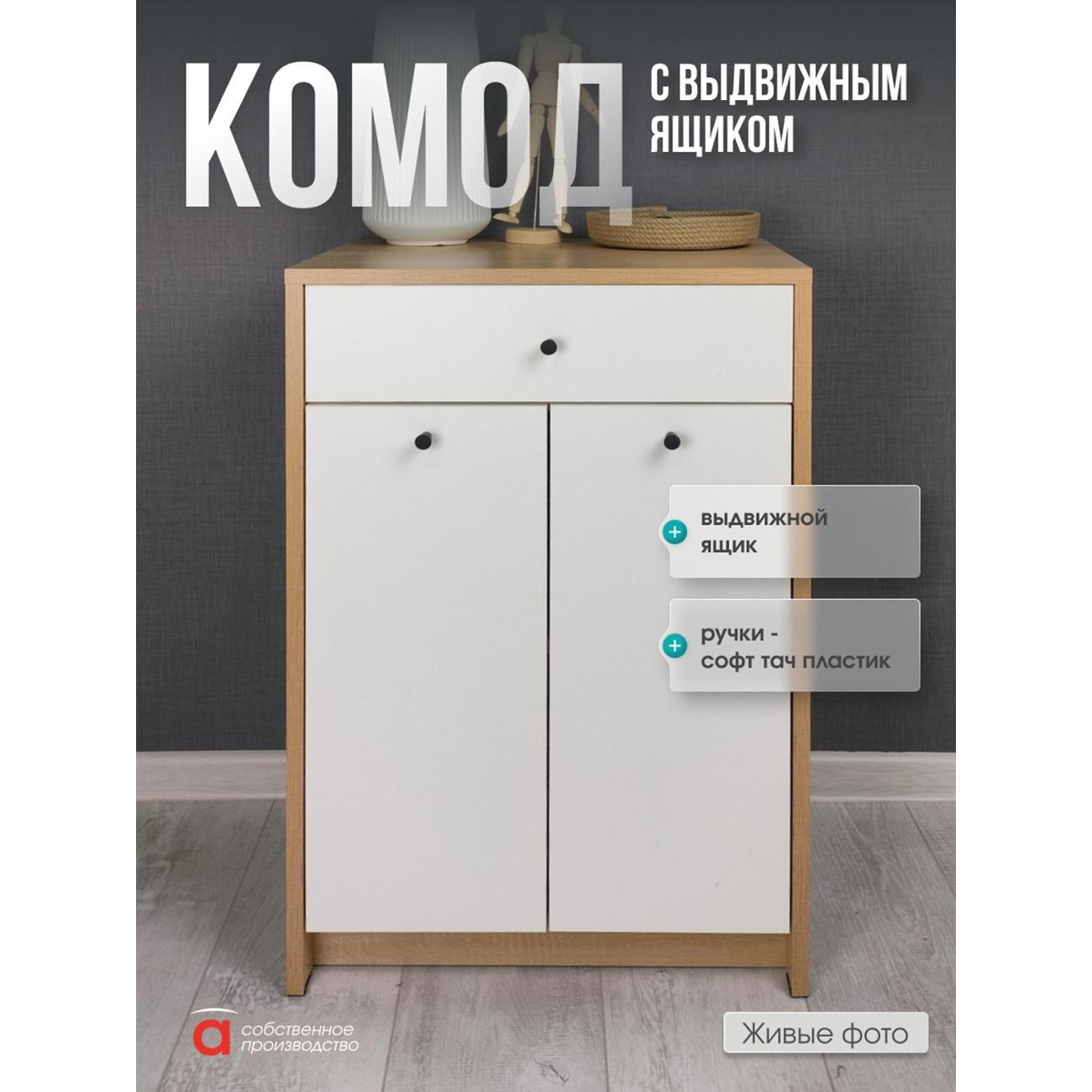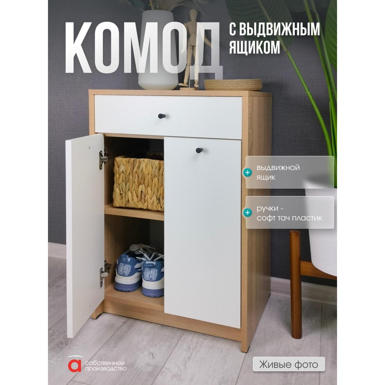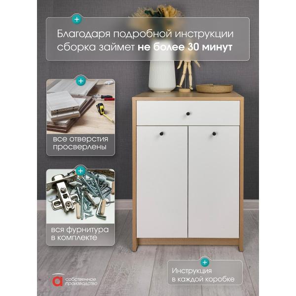 Элегантный и функциональный предмет мебели, выполненный в скандинавском стиле, станет отличным решением для хранения одежды и обуви. Узкий комод - тумба с дверцами и ящиком идеально подходит для размещения в прихожей или коридоре. Высокая конструкция обеспечивает удобство использования даже в небольших помещениях. Эта модель прекрасно впишется как в зал, так и в ванную комнату, благодаря универсальному дизайну. Этот продукт сочетает практичность и эстетичный внешний вид, делая его подходящим выбором для любого помещения. Он органично дополнит комплект мебели для прихожей либо станет самостоятельным элементом декора. Подходит для организации порядка даже на ограниченной площади. Комод с ящиком и дверками предназначен для хранения различных предметов и станет отличным решением в любой комнате. Он идеально подходит для спальни, кухни или ванной. Такой шкафчик можно использовать под обувь или как узкую систему хранения в комнате. Большая вместительность позволяет организовать пространство, а ящик поможет удобно разместить нужные мелочи. Этот универсальный предмет мебели может использоваться в детской комнате для хранения игрушек или в коридоре для аксессуаров. Также его можно установить на балконе или в ванную, чтобы держать под рукой необходимые мелочи. Шкафчик отлично впишется в интерьер благодаря своему цвету (дуб сонома/белый) и простому дизайну. Тумба комод может стать отличной основой для размещения телевизора, что делает его функциональным элементом. Узкая форма позволяет сэкономить пространство, а наличие дверок помогает скрыть содержимое от посторонних глаз. Ящик легко открывается и обеспечивает удобный доступ к хранению вещей. Мебель также подойдет для кухни — здесь она будет прекрасно выполнять функции тумбочки или мини-комода. Подходит не только для больших помещений, но и маленьких квартир благодаря своей компактной конструкции. С помощью такого комода можно создать стильное решение как в современном интерьере, так и в классическом. Используйте этот высококачественный мебельный элемент не только по прямому назначению, но и как оригинальный декор в интерьер. Данный вариант идеален для всех тех, кто ценит практичность и стиль одновременно. Максимальная нагрузка на ящик 5 кг. Необходимая фурнитура и инструкция для сборки входят в комплект.
