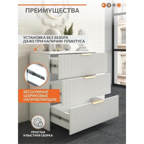Изготовленный из высококачественных материалов, этот комод обладает прочностью и долговечностью. Фасад выполнен из матового МДФ, что придаёт изделию элегантный вид. Золотые ручки, украшающие комод, добавляют роскоши и изысканности.