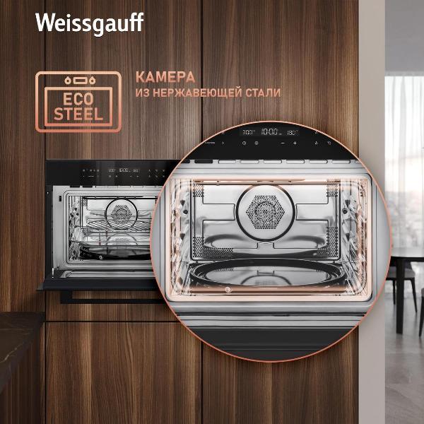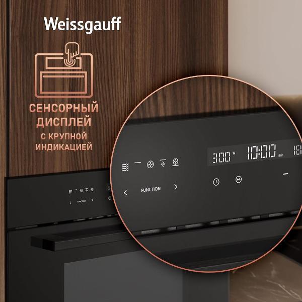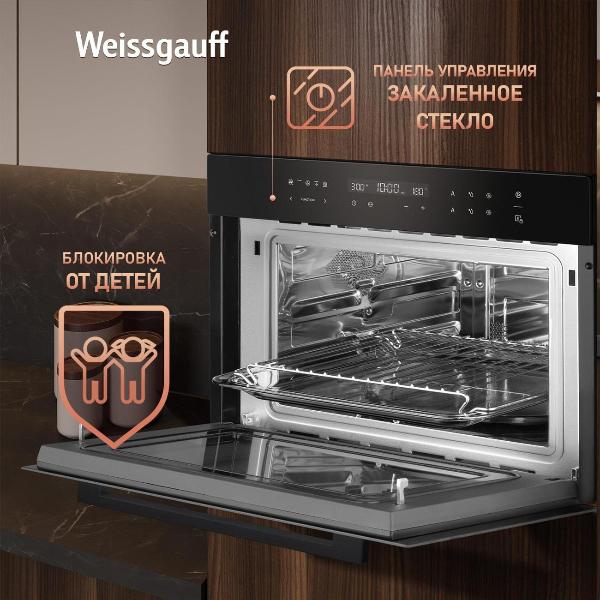 Компактный духовой шкаф Weissgauff OE 446 в корпусе цвета Black Edition обладает габаритами 45,2х59,5х55 см, фиксируется в нише размером 45х56х55 см. Объем камеры — 44 л. Дверь из двухслойного стекла оборудована доводчиком и блокиратором.