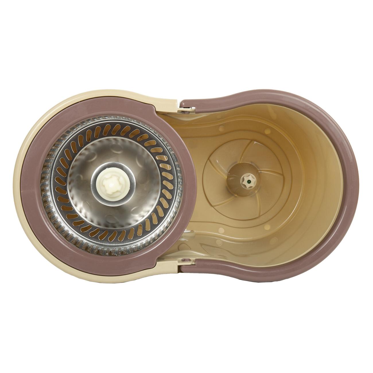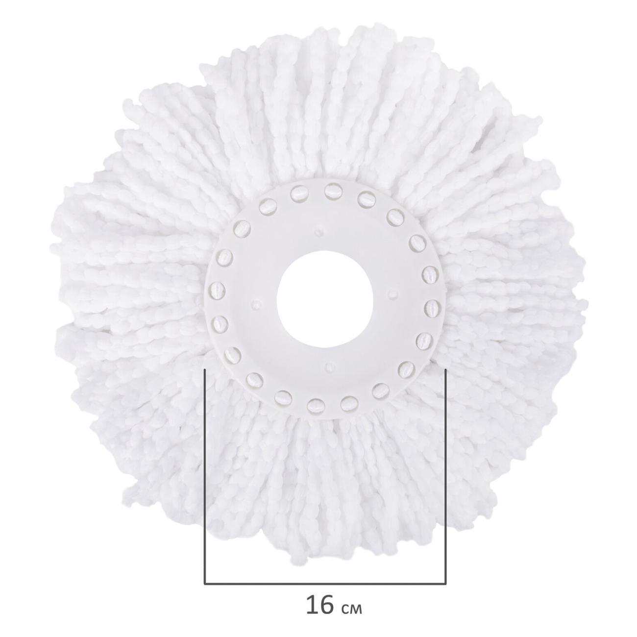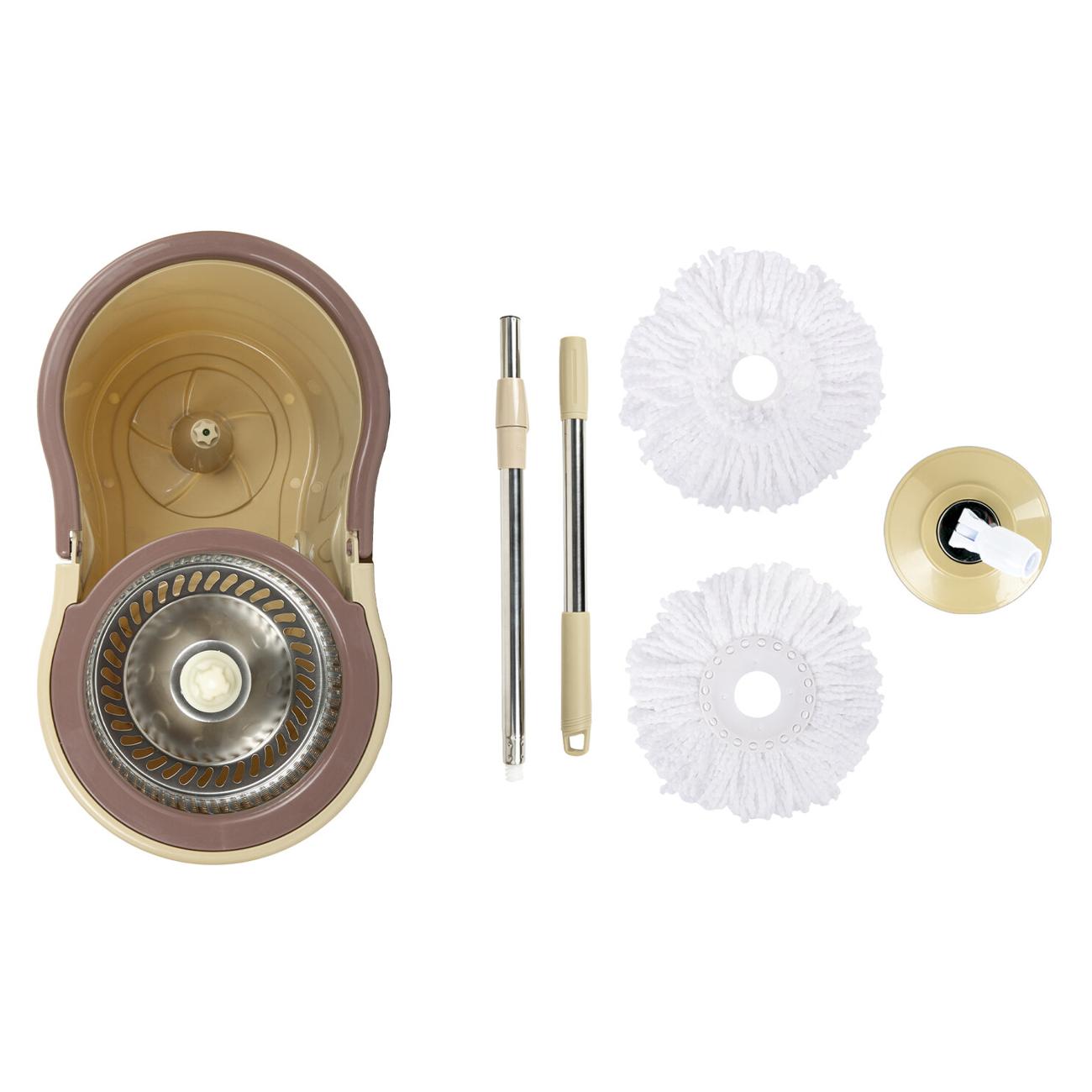В набор входят: ведро с системой отжима, швабра с круглой насадкой из микрофибры и запасная насадка.