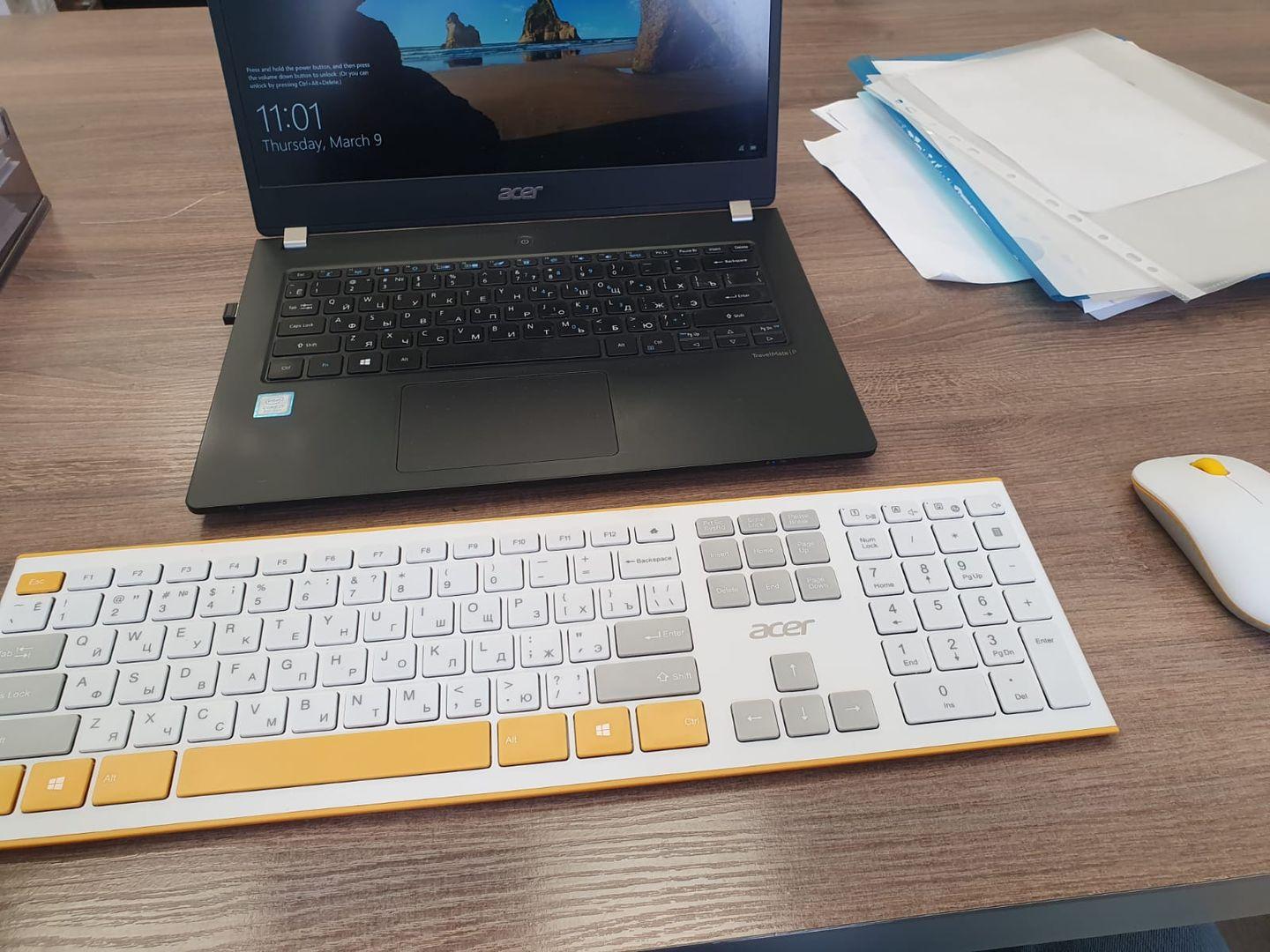 Всё работает идеально. Не зависает, не глючит, предельно приятные кнопки, клавиатура не громоздкая, тоненькая. Длина - 43.5 см, ширина - 12,7 см, толщина - 5 мм. Приятная расцветка. Раскладка удобная, как в классических вариантах. К мышке тоже нареканий нет. Ищите usb внутри мышки). Есть кнопки включения и выключения, как на клавиатуре, так и на мышке, выключаю на ночь, чтобы не сажать батарейки. Батарейки идут в комплекте. Пластик, конечно, визуально не очень практичный, но внешний вид хороший.