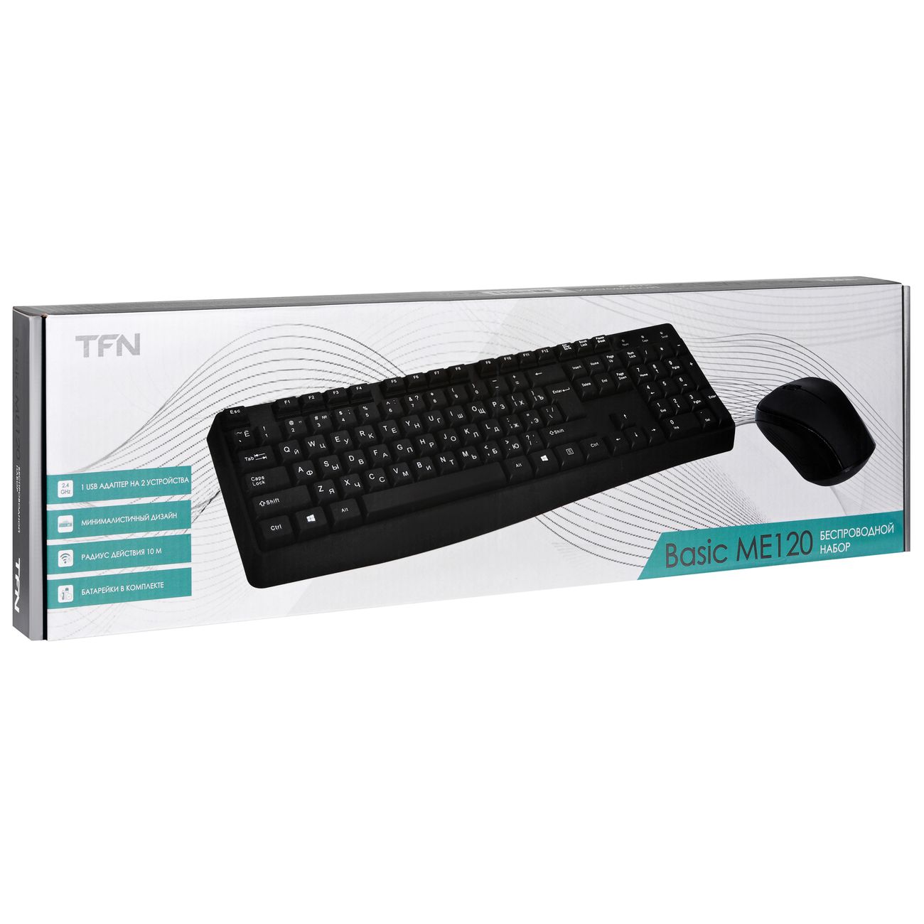 В комплект TFN Basic ME120 входят клавиатура мембранного типа размерами 440 х 138 х 34 мм и оптическая мышь с тремя кнопками и скроллером. Это беспроводные устройства, которые подключаются к компьютеру по радиоканалу на частоте 2,4 ГГц.