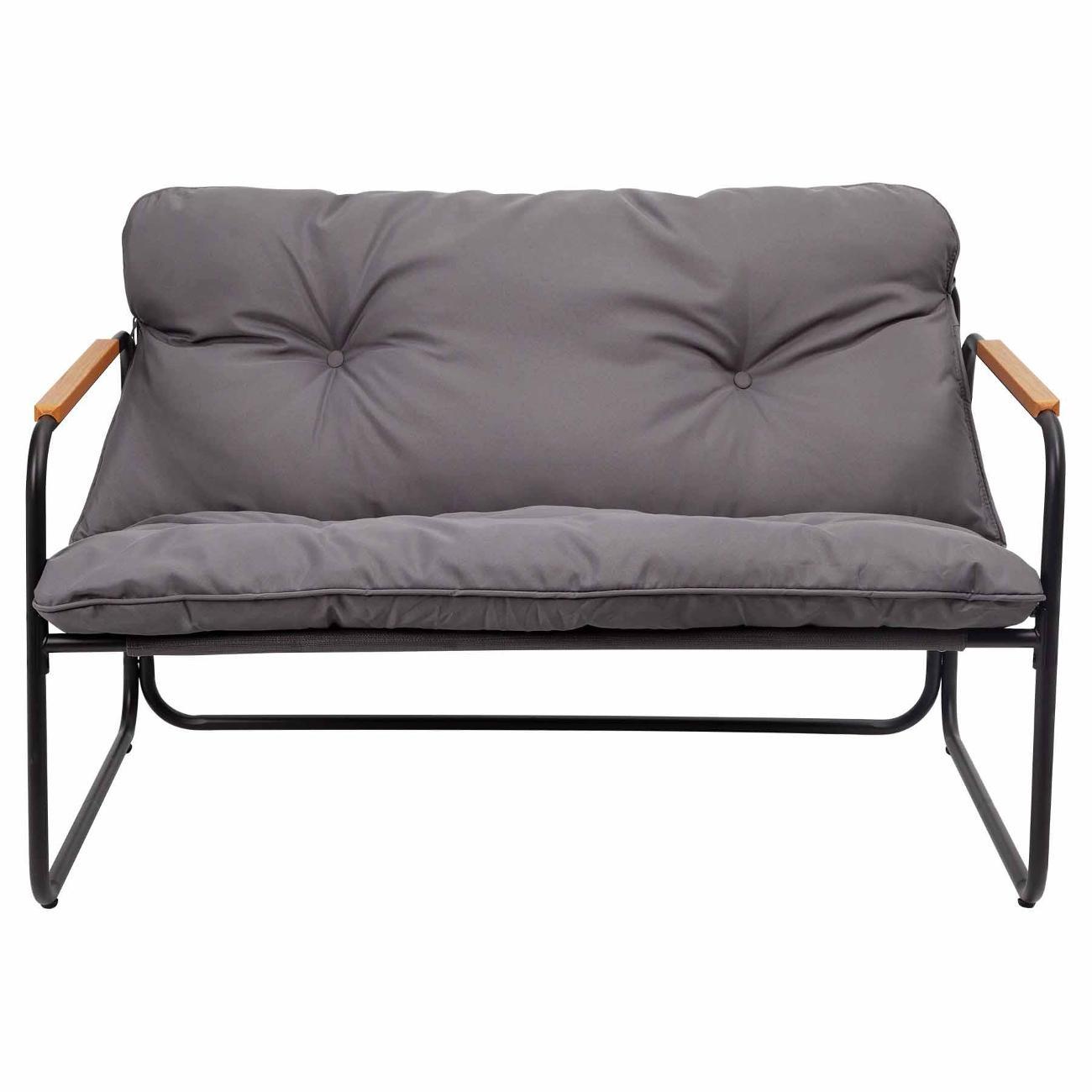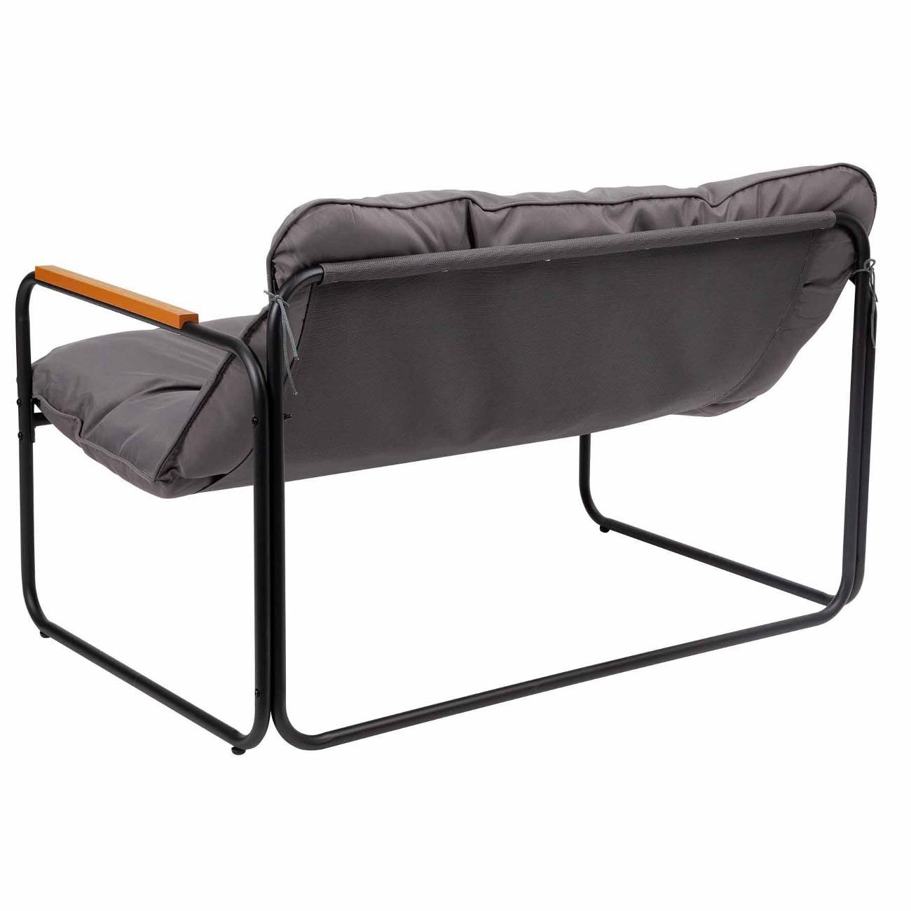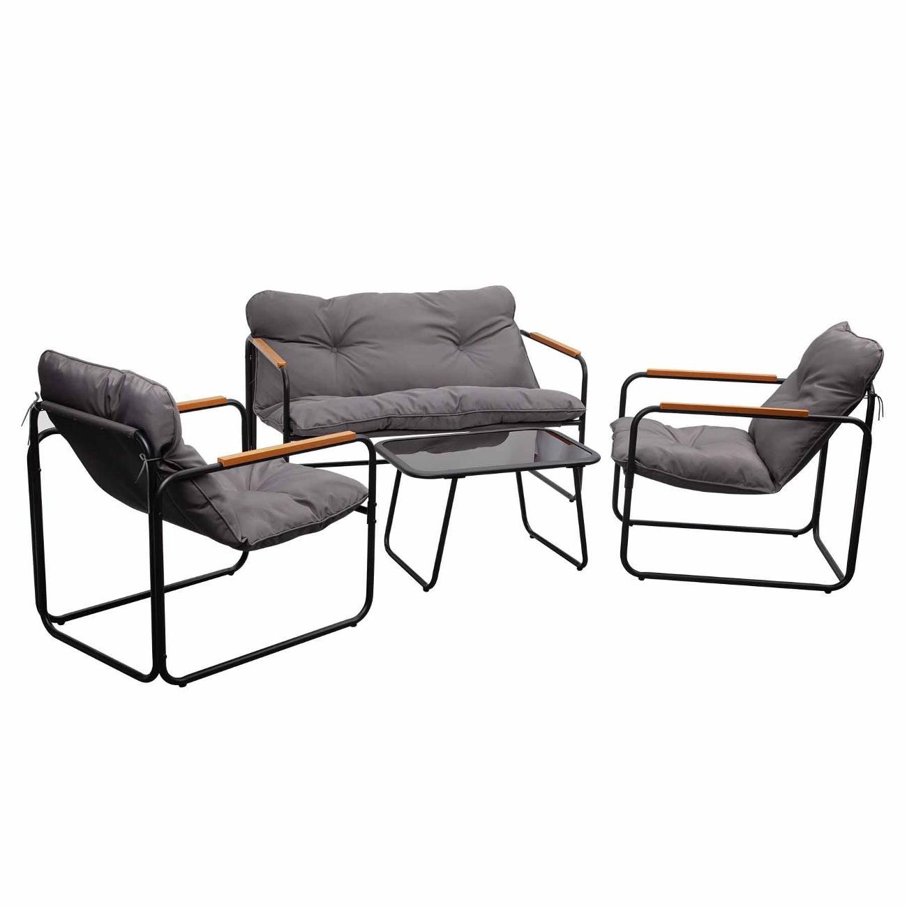 В набор входят удобный двухместный диван, 2 кресла и низкий маленький столик с прочной столешницей из закаленного стекла. Каркас мебели в стиле лофт выполнен из устойчивой к внешним воздействиям нержавеющей стали с порошковым окрашиванием, а сиденья и спинки изготовлены из текстилена, который отлично переносит любые погодные условия. Съёмные серые подушки из полиэстера с синтетическим наполнителем придают мягкость и уют.