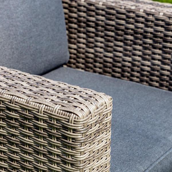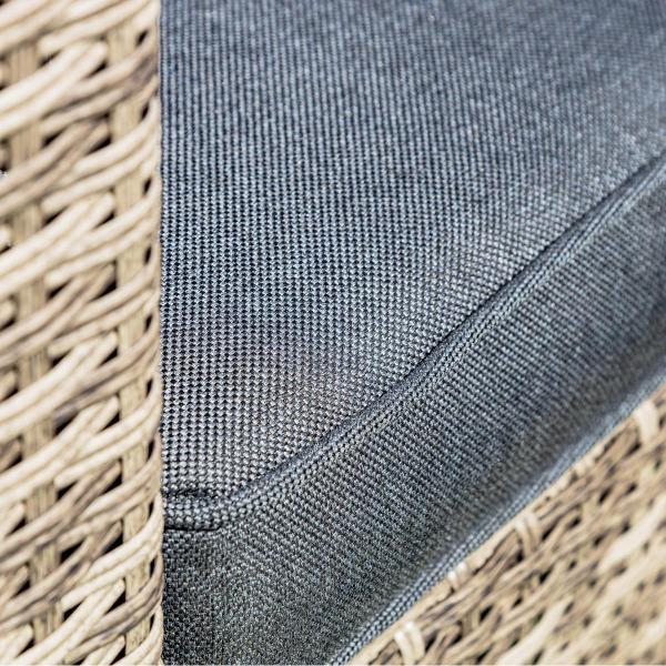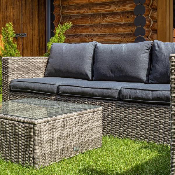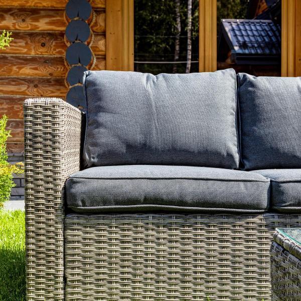 Приятный серый оттенок ротанга прекрасно гармонирует с мягкими темно-серыми подушками, создавая эффектный контраст, придавая комплекту изысканный внешний вид.