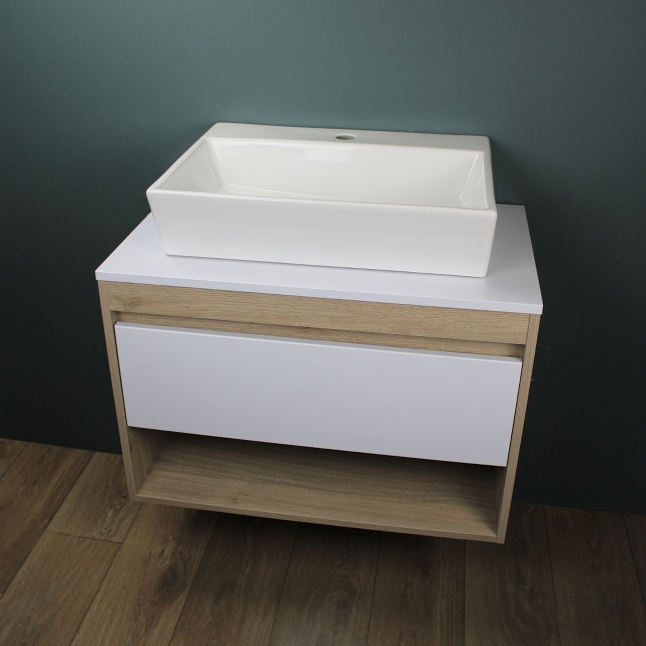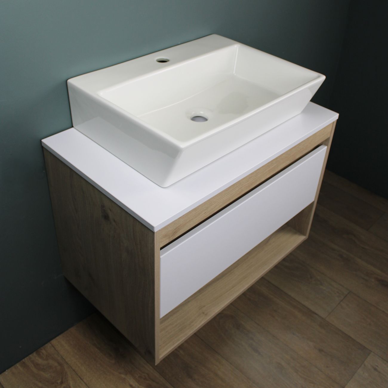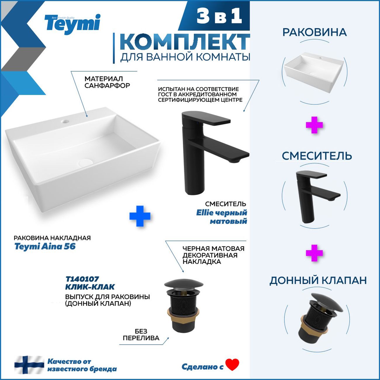1215918 В комплект 3 в 1 входит: 1. Раковина накладная Teymi Aina 56 с полочкой под смеситель, белая; 2. Смеситель для раковины Teymi Ellie, черный матовый; 3. Донный клапан Teymi для раковины без перелива, черный. Характеристики раковины: -- Артикул производителя: T50005; -- Серия / коллекция: Aina; -- Модель: Aina 56; -- Тип раковины: накладная; -- Установка: на столешницу / на тумбу; -- Возможность встройки: нет; -- Материал изготовления: санфарфор; -- Цвет: белый глянцевый; -- Ширина: 565 мм; -- Глубина: 425 мм; -- Высота от столешницы: 140 мм; -- Количество чаш: одна; -- Мыльница: нет; -- Полотенцедержатель: нет; -- Расположение крыла: без крыла; -- Форма: прямоугольная; -- Отверстие под смеситель: одно, на полочке; -- Отверстие под слив: одно; -- Отверстие под перелив: нет; -- Диаметр сливного отверстия: 45 мм; -- Сливная арматура: в поставку не входит; -- Слив-перелив: в поставку не входит; -- Страна изготовления: Китай; -- Страна бренда: Финляндия; -- Бренд: Teymi. Характеристики смесителя: -- Наименование: Смеситель для раковины Teymi Ellie, черный матовый; -- Артикул производителя: T10227; -- Размеры: высота 175 мм Х высота излива 130 мм; -- Покрытие: лакокрасочное; -- Цвет: чёрный; -- Поверхность: матовая; -- Тип смесителя: однорычажный; -- Количество режимов струи: 1; -- Картридж керамический: 35 мм; -- Гибкая подводка 40 см: 2 шт; -- Аэратор: да; -- Крепление: гайка; -- Поворотный излив: нет; -- В комплект входит гибкая подводка: да; -- Гарантия производителя: 2 года; -- Страна бренда: Финляндия; -- Страна производства: Китай. Характеристики выпуска: -- Артикул производителя: T140107; -- Тип изделия: донный клапан для раковины; -- Материал корпуса: цинк; -- Цвет крышки: черный; -- Покрытие крышки: глянцевое; -- Материал крышки: керамика; -- Материал гайки: латунь; -- Функция клик-клак: да; -- Скорость слива воды: 52 л/мин; -- Диаметр отверстия раковины: 45 мм; -- Гарантия: 2 года;